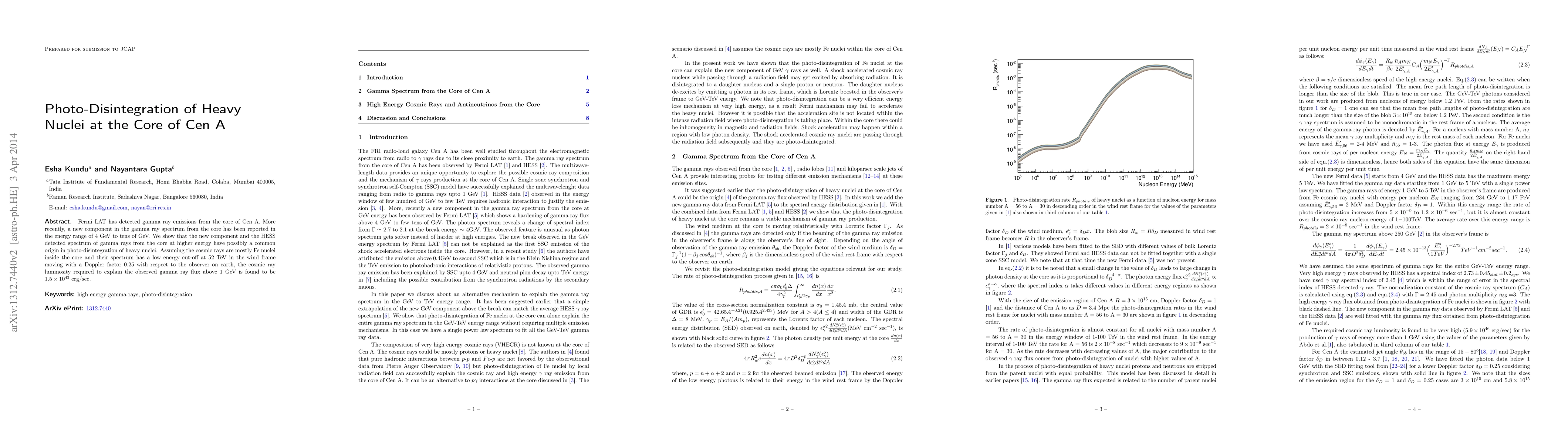 This paper investigates the gamma ray emissions from the core of Cen A, suggesting that a new detected component in the 4-40 GeV range, along with higher energy gamma rays, may originate from the photo-disintegration of heavy nuclei. The study estimates a cosmic ray luminosity of $1.5\times 10^{43}$ erg/sec to explain the observed gamma ray flux, assuming Fe nuclei as the primary cosmic ray component.