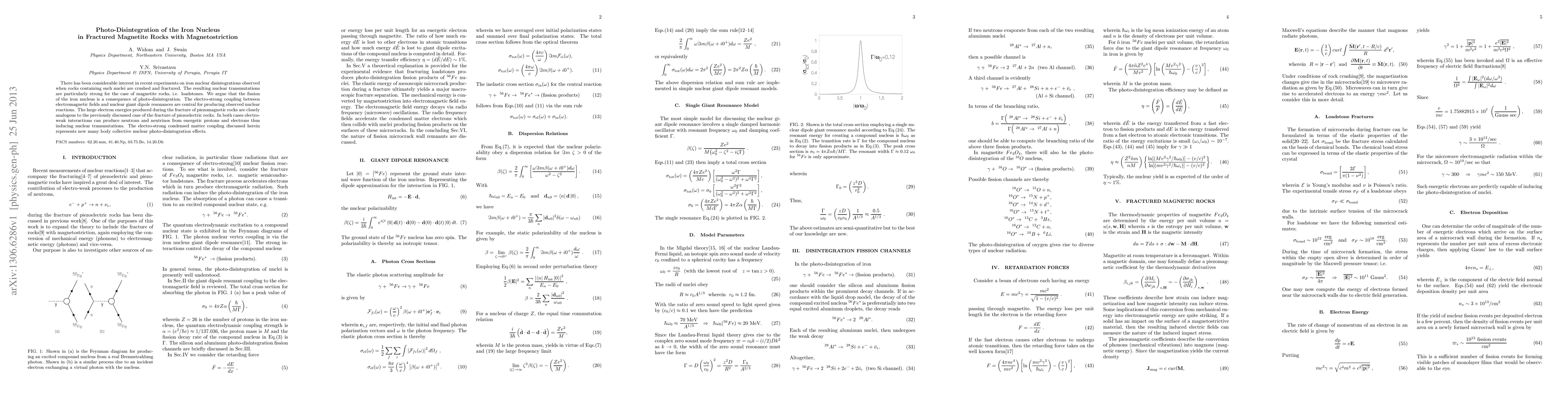 Researchers investigate how iron nuclei in magnetite rocks break apart when crushed, producing nuclear reactions through photo-disintegration. They suggest that electromagnetic fields play a key role in this process, similar to the fracture of piezoelectric rocks.