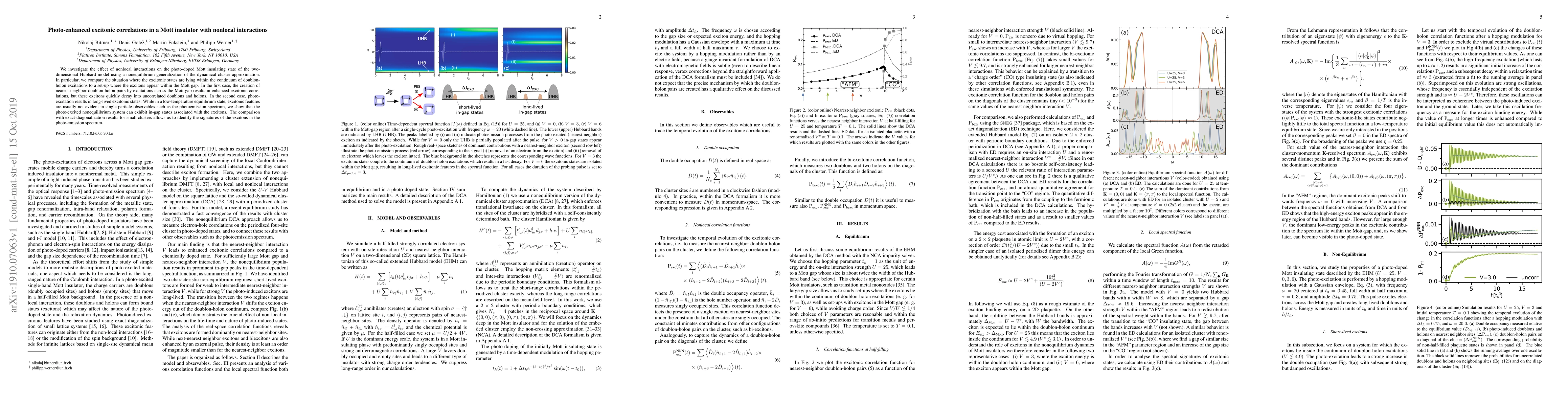 We investigate the effect of nonlocal interactions on the photo-doped Mott insulating state of the two-dimensional Hubbard model using a nonequilibrium generalization of the dynamical cluster approximation. In particular, we compare the situation where the excitonic states are lying within the continuum of doublon-holon excitations to a set-up where the excitons appear within the Mott gap. In the first case, the creation of nearest-neighbor doublon-holon pairs by excitations across the Mott gap results in enhanced excitonic correlations, but these excitons quickly decay into uncorrelated doublons and holons. In the second case, photo-excitation results in long-lived excitonic states. While in a low-temperature equilibrium state, excitonic features are usually not evident in single-particle observables such as the photoemission spectrum, we show that the photo-excited nonequilibrium system can exhibit in-gap states associated with the excitons. The comparison with exact-diagonalization results for small clusters allows us to identify the signatures of the excitons in the photo-emission spectrum.