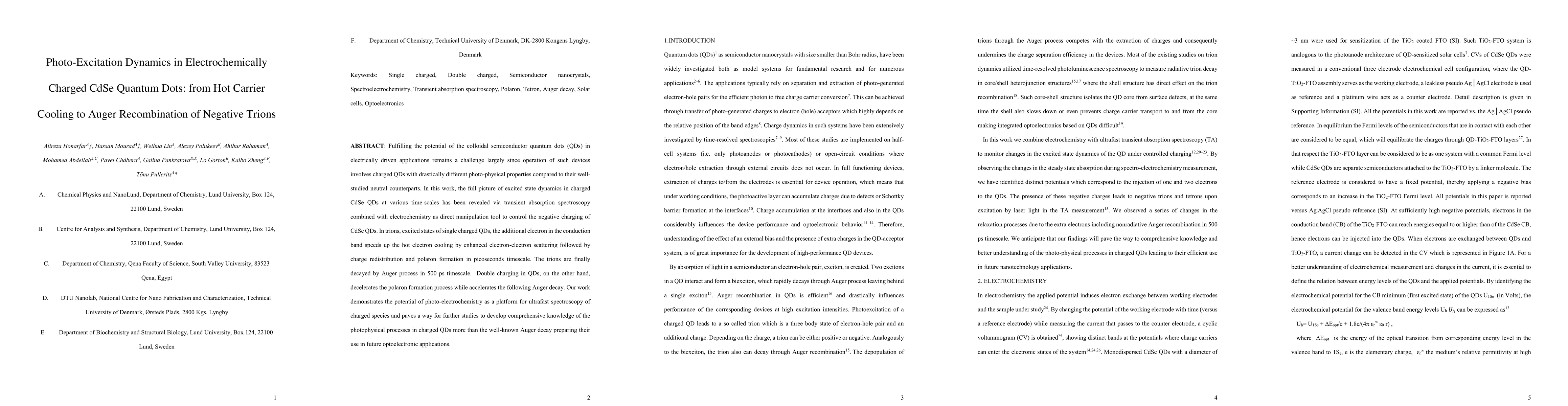 Fulfilling the potential of the colloidal semiconductor quantum dots (QDs) in electrically driven applications remains a challenge largely since operation of such devices involves charged QDs with drastically different photo-physical properties compared to their well-studied neutral counterparts. In this work, the full picture of excited state dynamics in charged CdSe QDs at various time-scales has been revealed via transient absorption spectroscopy combined with electrochemistry as direct manipulation tool to control the negative charging of CdSe QDs. In trions, excited states of single charged QDs, the additional electron in the conduction band speeds up the hot electron cooling by enhanced electron-electron scattering followed by charge redistribution and polaron formation in picoseconds timescale. The trions are finally decayed by Auger process in 500 ps timescale. Double charging in QDs, on the other hand, decelerates the polaron formation process while accelerates the following Auger decay. Our work demonstrates the potential of photo-electrochemistry as a platform for ultrafast spectroscopy of charged species and paves a way for further studies to develop comprehensive knowledge of the photophysical processes in charged QDs more than the well-known Auger decay preparing their use in future optoelectronic applications.