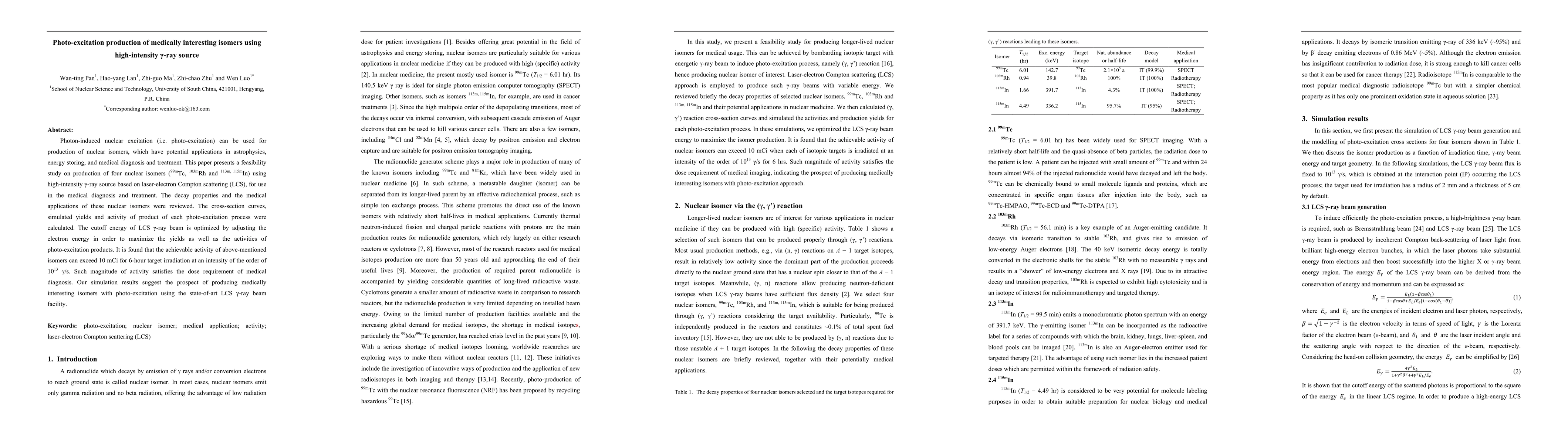 This paper explores the feasibility of producing medically useful nuclear isomers ({99m}Tc, {103m}Rh, and {113m, 115m}In) via photo-excitation using a high-intensity γ-ray source based on laser-electron Compton scattering. The study optimizes the γ-ray beam's cutoff energy to maximize yields and activity, achieving activities exceeding 10 mCi, sufficient for medical diagnostic applications.