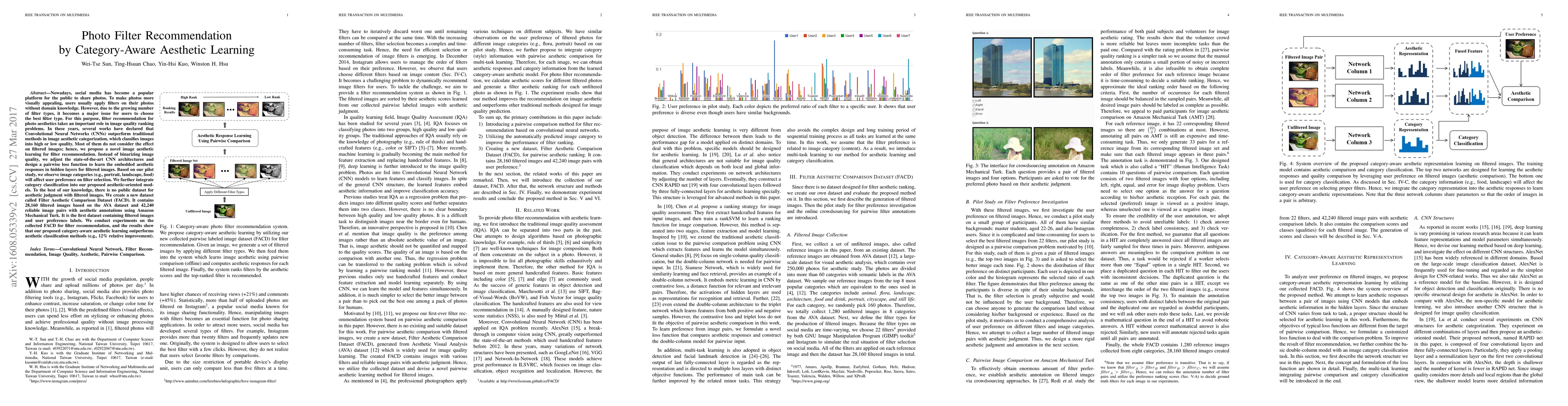 This paper proposes a novel method for recommending photo filters based on category-aware aesthetic learning using Convolutional Neural Networks (CNNs). The authors introduce a new dataset, Filter Aesthetic Comparison Dataset (FACD), to study filtered images and user preferences, and demonstrate a 12% relative improvement over existing aesthetic classification methods.