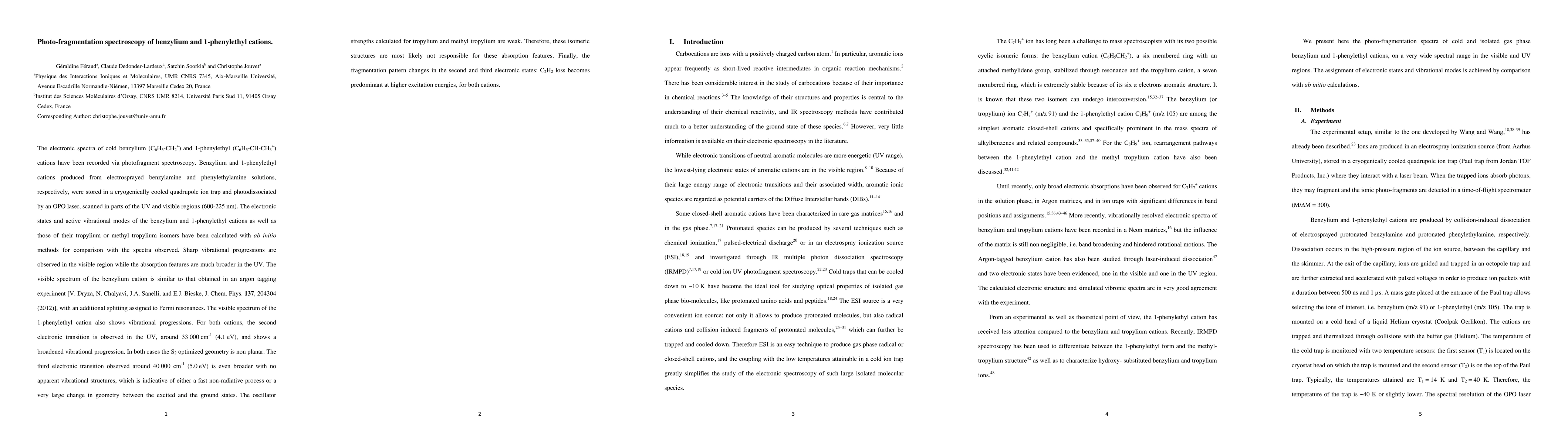 The electronic spectra of cold benzylium (C6H5-CH2+) and 1-phenylethyl (C6H5-CH-CH3+)cations have been recorded via photofragment spectroscopy. Benzylium and 1-phenylethyl cations produced from electrosprayed benzylamine and phenylethylamine solutions, respectively, were stored in a cryogenically cooled quadrupole ion trap and photodissociated by an OPO laser, scanned in parts of the UV and visible regions (600-225 nm). The electronic states and active vibrational modes of the benzylium and 1-phenylethyl cations as well as those of their tropylium or methyl tropylium isomers have been calculated with ab initio methods for comparison with the spectra observed. Sharp vibrational progressions are observed in the visible region while the absorption features are much broader in the UV. The visible spectrum of the benzylium cation is similar to that obtained in an argon tagging experiment [V. Dryza, N. Chalyavi, J.A. Sanelli, and E.J. Bieske, J. Chem. Phys. 137, 204304 (2012)], with an additional splitting assigned to Fermi resonances. The visible spectrum of the 1-phenylethyl cation also shows vibrational progressions. For both cations, the second electronic transition is observed in the UV, around 33 000 cm-1 (4.1 eV), and shows a broadened vibrational progression. In both cases the S2 optimized geometry is non planar. The third electronic transition observed around 40 000 cm-1 (5.0 eV) is even broader with no apparent vibrational structures, which is indicative of either a fast non-radiative process or a very large change in geometry between the excited and the ground states. The oscillator strengths calculated for tropylium and methyl tropylium are weak. Therefore, these isomeric structures are most likely not responsible for these absorption features. Finally, the fragmentation pattern changes in the second and third electronic states: C2H2 loss becomes predominant at higher excitation energies, for both cations.
