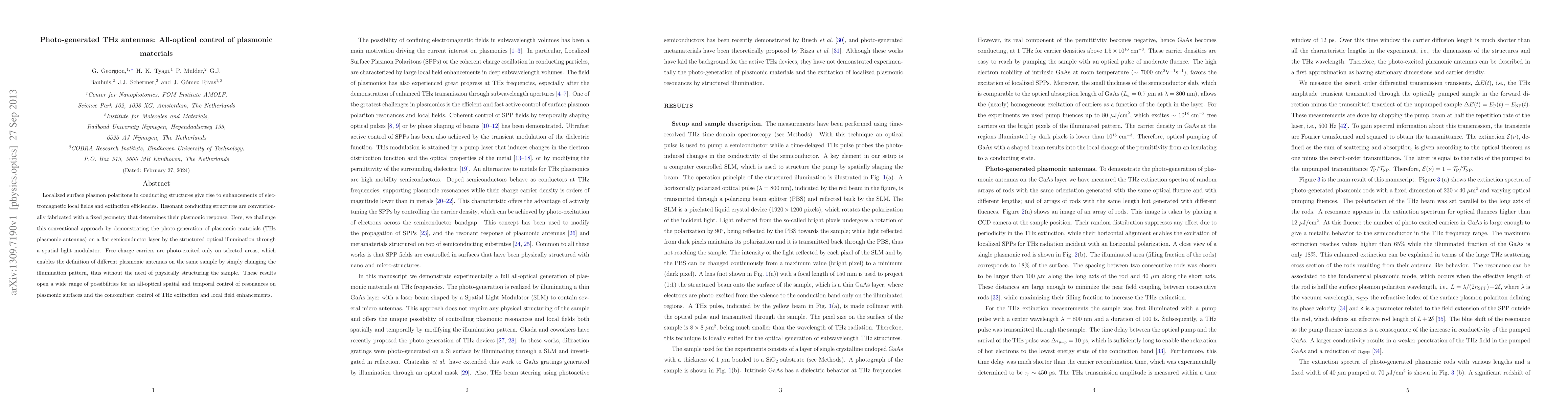 Localized surface plasmon polaritons in conducting structures give rise to enhancements of electromagnetic local fields and extinction efficiencies. Resonant conducting structures are conventionally fabricated with a fixed geometry that determines their plasmonic response. Here, we challenge this conventional approach by demonstrating the photo-generation of plasmonic materials (THz plasmonic antennas) on a flat semiconductor layer by the structured optical illumination through a spatial light modulator. Free charge carriers are photo-excited only on selected areas, which enables the definition of different plasmonic antennas on the same sample by simply changing the illumination pattern, thus without the need of physically structuring the sample. These results open a wide range of possibilities for an all-optical spatial and temporal control of resonances on plasmonic surfaces and the concomitant control of THz extinction and local field enhancements.