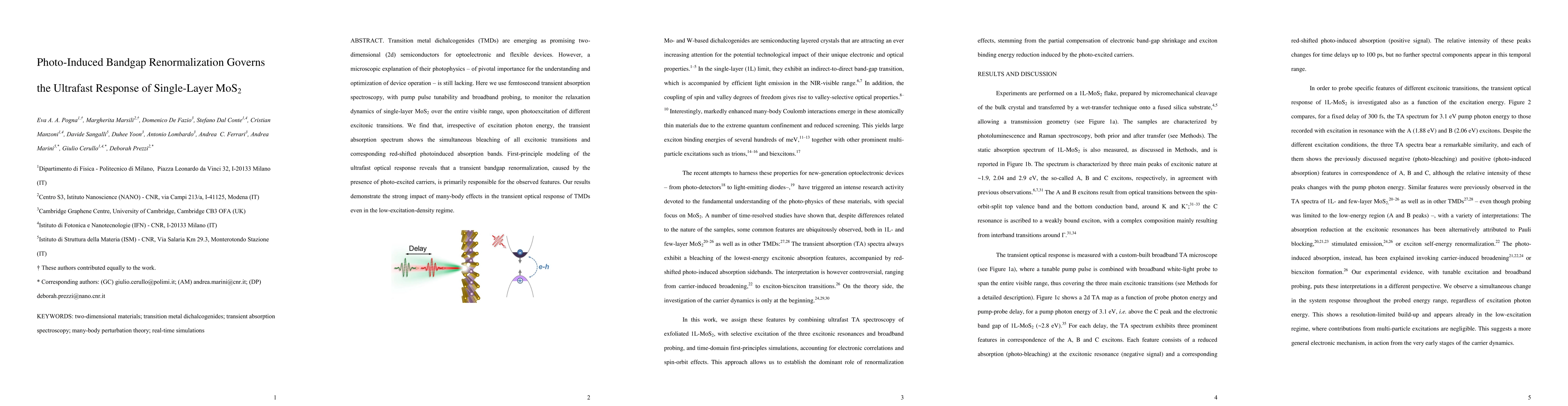 Transition metal dichalcogenides (TMDs) are emerging as promising two-dimensional (2d) semiconductors for optoelectronic and flexible devices. However, a microscopic explanation of their photophysics -- of pivotal importance for the understanding and optimization of device operation -- is still lacking. Here we use femtosecond transient absorption spectroscopy, with pump pulse tunability and broadband probing, to monitor the relaxation dynamics of single-layer MoS2 over the entire visible range, upon photoexcitation of different excitonic transitions. We find that, irrespective of excitation photon energy, the transient absorption spectrum shows the simultaneous bleaching of all excitonic transitions and corresponding red-shifted photoinduced absorption bands. First-principle modeling of the ultrafast optical response reveals that a transient bandgap renormalization, caused by the presence of photo-excited carriers, is primarily responsible for the observed features. Our results demonstrate the strong impact of many-body effects in the transient optical response of TMDs even in the low-excitation-density regime.
