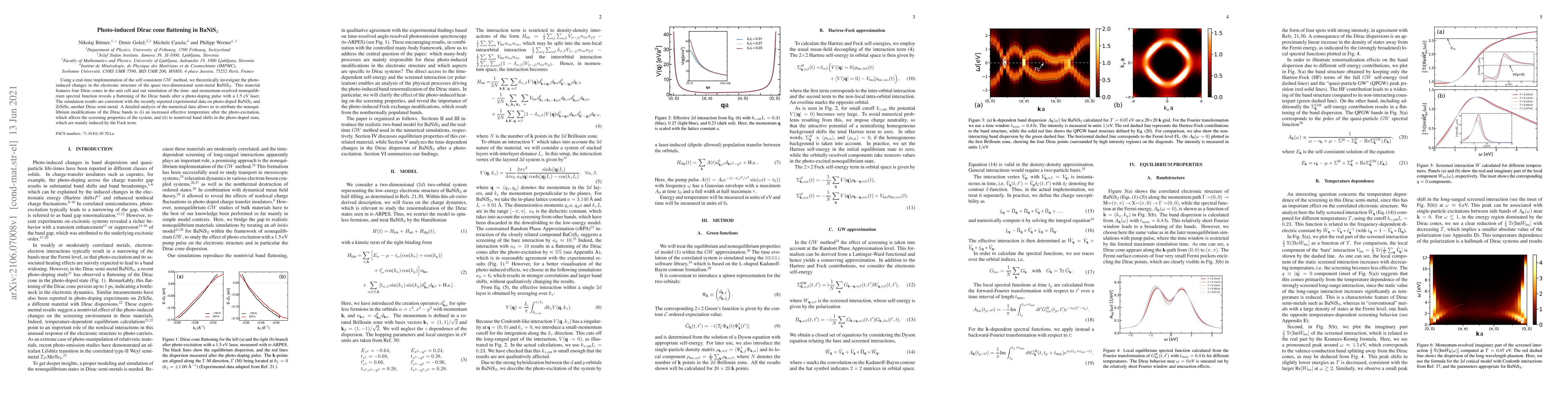 Using a real-time implementation of the self-consistent $GW$ method, we theoretically investigate the photo-induced changes in the electronic structure of the quasi two-dimensional semi-metal BaNiS$_2$. This material features four Dirac cones in the unit cell and our simulation of the time- and momentum-resolved nonequilibrium spectral function reveals a flattening of the Dirac bands after a photo-doping pulse with a 1.5 eV laser. The simulation results are consistent with the recently reported experimental data on photo-doped BaNiS$_2$ and ZrSiSe, another Dirac semi-metal. A detailed analysis of the numerical data allows us to attribute the nonequilibrium modifications of the Dirac bands to (i) an increased effective temperature after the photo-excitation, which affects the screening properties of the system, and (ii) to nontrivial band shifts in the photo-doped state, which are mainly induced by the Fock term.
