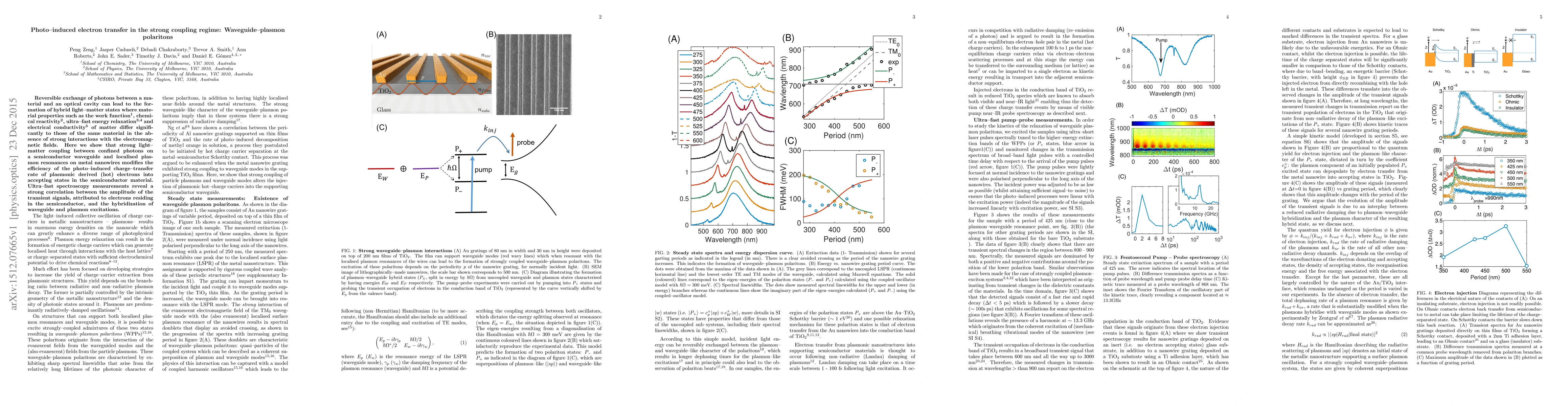 Reversible exchange of photons between a material and an optical cavity can lead to the formation of hybrid light--matter states where material properties such as the work function\cite{Hutchison_AM2013a}, chemical reactivity\cite{Hutchison_ACIE2012a}, ultra--fast energy relaxation \cite{Salomon_ACIE2009a,Gomez_TJOPCB2012a} and electrical conductivity\cite{Orgiu_NM2015a} of matter differ significantly to those of the same material in the absence of strong interactions with the electromagnetic fields. Here we show that strong light--matter coupling between confined photons on a semiconductor waveguide and localised plasmon resonances on metal nanowires modifies the efficiency of the photo--induced charge--transfer rate of plasmonic derived (hot) electrons into accepting states in the semiconductor material. Ultra--fast spectroscopy measurements reveal a strong correlation between the amplitude of the transient signals, attributed to electrons residing in the semiconductor, and the hybridization of waveguide and plasmon excitations.