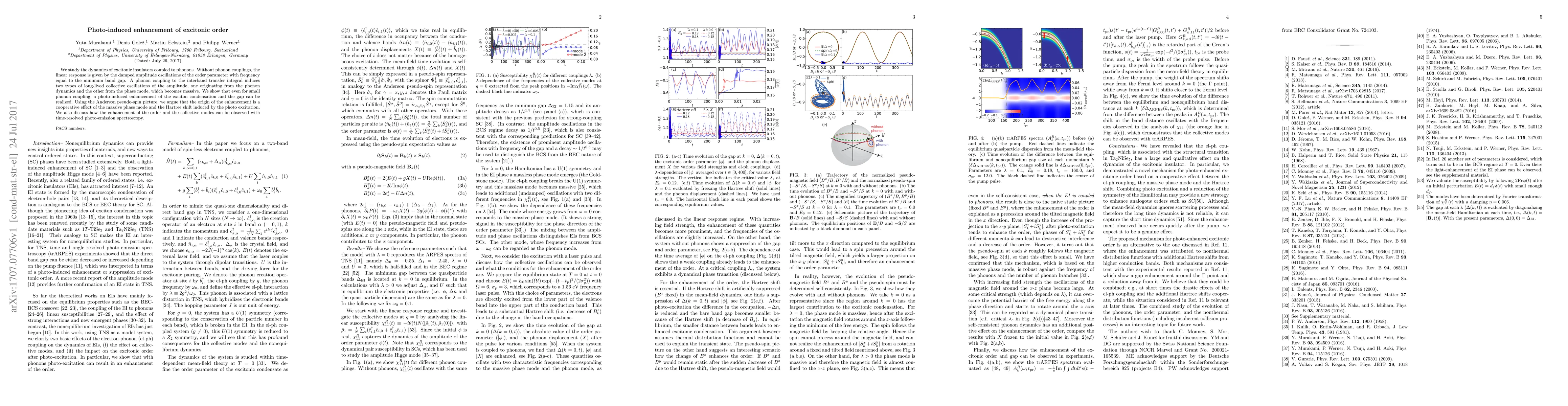 We study the dynamics of excitonic insulators coupled to phonons. Without phonon couplings, the linear response is given by the damped amplitude oscillations of the order parameter with frequency equal to the minimum band gap. A phonon coupling to the interband transfer integral induces two types of long-lived collective oscillations of the amplitude, one originating from the phonon dynamics and the other from the phase mode, which becomes massive. We show that even for small phonon coupling, a photo-induced enhancement of the exciton condensation and the gap can be realized. Using the Anderson pseudo-spin picture, we argue that the origin of the enhancement is a cooperative effect of the massive phase mode and the Hartree shift induced by the photo excitation. We also discuss how the enhancement of the order and the collective modes can be observed with time-resolved photo-emission spectroscopy.