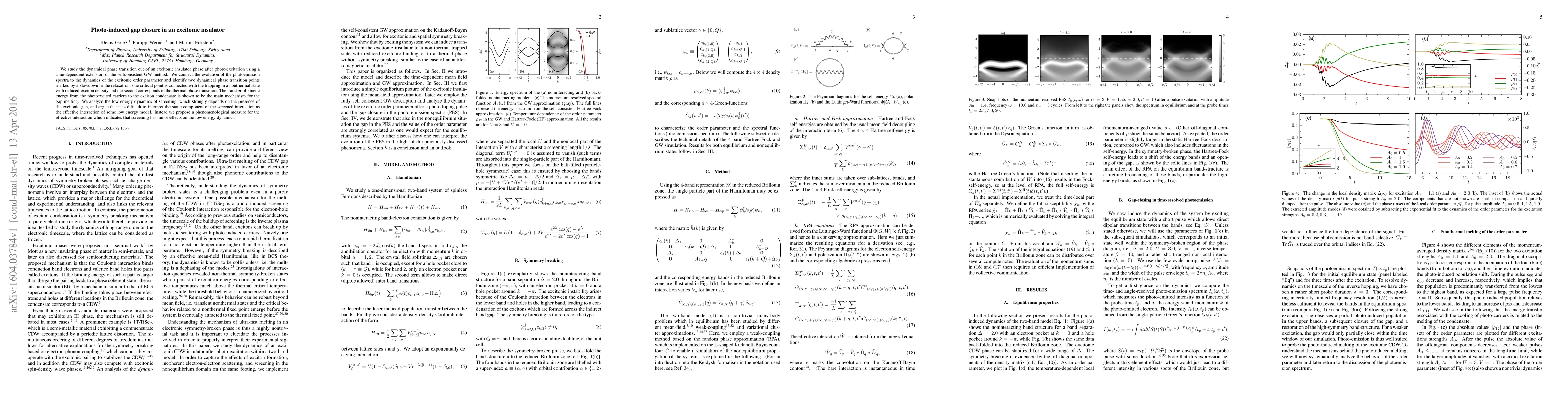 We study the dynamical phase transition out of an excitonic insulator phase after photo-excitation using a time-dependent extension of the selfconsistent GW method. We connect the evolution of the photoemission spectra to the dynamics of the excitonic order parameter and identify two dynamical phase transition points marked by a slowdown in the relaxation: one critical point is connected with the trapping in a nonthermal state with reduced exciton density and the second corresponds to the thermal phase transition. The transfer of kinetic energy from the photoexcited carriers to the exciton condensate is shown to be the main mechanism for the gap melting. We analyze the low energy dynamics of screening, which strongly depends on the presence of the excitonic gap, and argue that it is difficult to interpret the static component of the screened interaction as the effective interaction of some low energy model. Instead we propose a phenomenological measure for the effective interaction which indicates that screening has minor effects on the low energy dynamics.