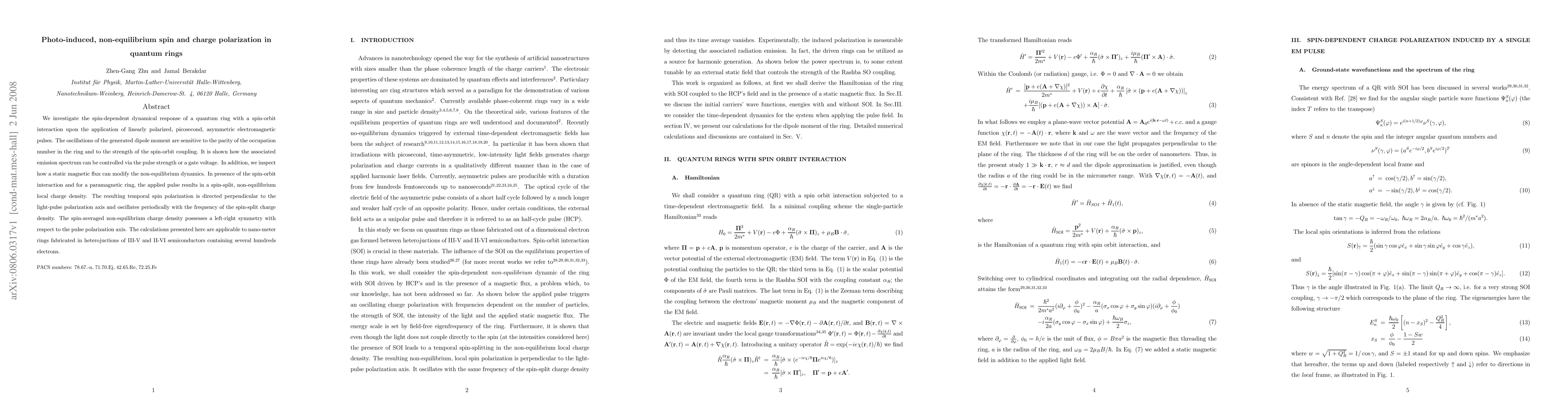 We investigate the spin-dependent dynamical response of a quantum ring with a spin-orbit interaction upon the application of linearly polarized, picosecond, asymmetric electromagnetic pulses. The oscillations of the generated dipole moment are sensitive to the parity of the occupation number in the ring and to the strength of the spin-orbit coupling. It is shown how the associated emission spectrum can be controlled via the pulse strength or a gate voltage. In addition, we inspect how a static magnetic flux can modify the non-equilibrium dynamics. In presence of the spin-orbit interaction and for a paramagnetic ring, the applied pulse results in a spin-split, non-equilibrium local charge density. The resulting temporal spin polarization is directed perpendicular to the light-pulse polarization axis and oscillates periodically with the frequency of the spin-split charge density. The spin-averaged non-equilibrium charge density possesses a left-right symmetry with respect to the pulse polarization axis. The calculations presented here are applicable to nano-meter rings fabricated in heterojuctions of III-V and II-VI semiconductors containing several hundreds electrons.