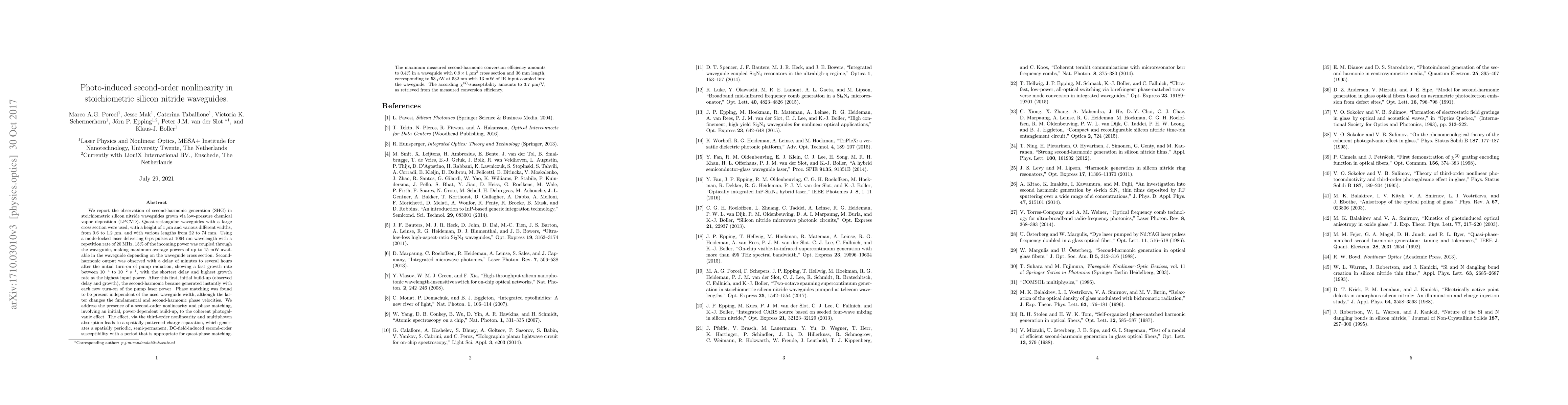 The research demonstrates second-harmonic generation in stoichiometric silicon nitride waveguides using a mode-locked laser. A power-dependent build-up, attributed to the photogalvanic effect, leads to a spatially periodic, semi-permanent, DC-field-induced second-order susceptibility. The maximum second-harmonic conversion efficiency is 0.4% with an input of 13 mW at 1064 nm, yielding 53 μW at 532 nm, and the measured $chi^{(2)}$ is 3.7 pm/V.