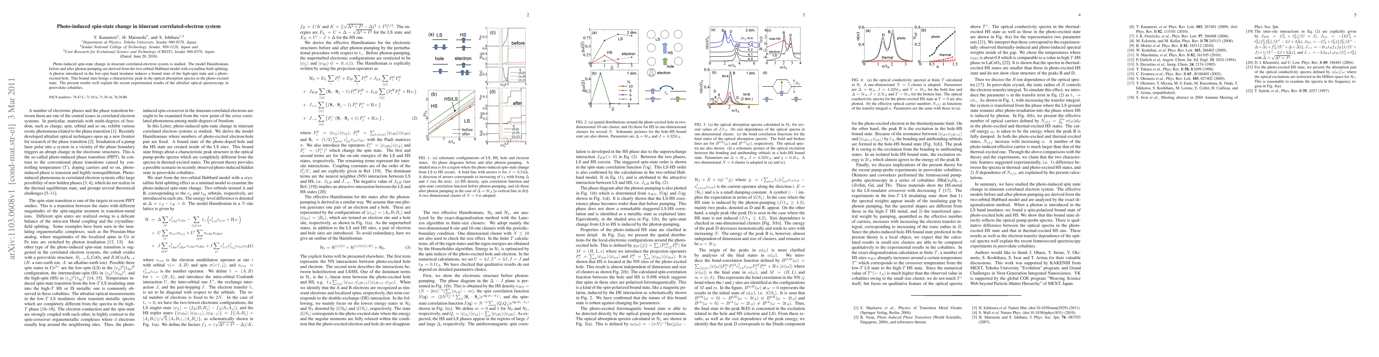 Photo-induced spin-state change in itinerant correlated-electron system is studied. The model Hamiltonians before and after photon-pumping are derived from the two-orbital Hubbard model with crystalline field splitting. A photon introduced in the low-spin band insulator induces a bound state of the high-spin state and a photoexcited hole. This bound state brings a characteristic peak in the optical absorption spectra in the photo-excited state. The resent results well explain the recent experimental results of the ultrafast optical spectroscopy in perovskite cobaltites.