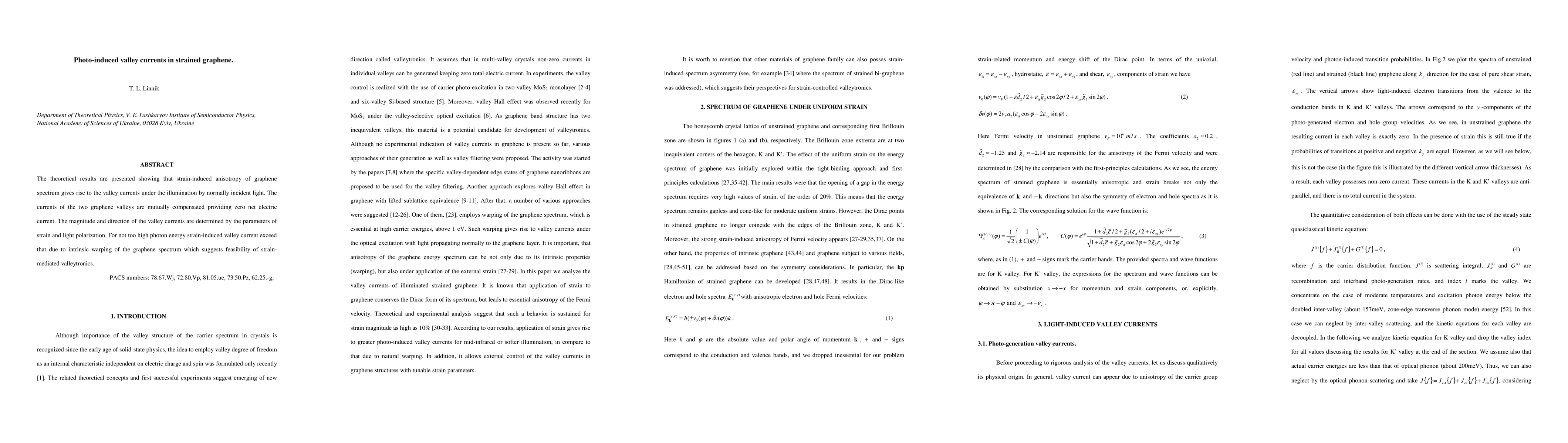 This paper demonstrates that strain-induced anisotropy in graphene can generate photo-induced valley currents under light illumination, with the currents from the two valleys canceling each other out to produce zero net electric current. The study suggests that strain-mediated valleytronics could be feasible, especially for lower photon energies.