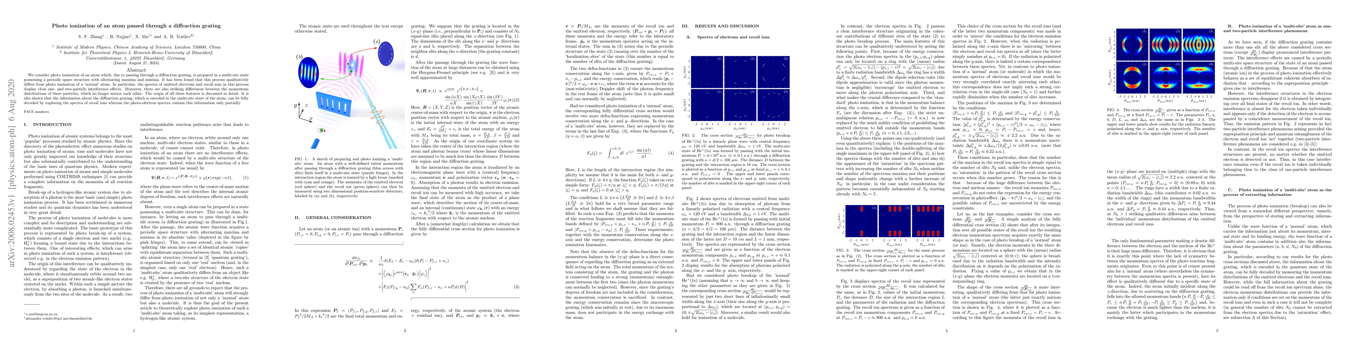 We consider photo ionization of an atom which, due to passing through a diffraction grating, is prepared in a multi-site state possessing a periodic space structure with alternating maxima and minima. It has been found that this process qualitatively differs from photo ionization of a 'normal' atom. In particular, the spectra of emitted electrons and recoil ions in this process display clear one- and two-particle interference effects. Moreover, there are also striking differences between the momentum distributions of these particles, which no longer mirror each other. The origin of all these features is discussed in detail. It is also shown that the information about the diffraction grating, which is encoded in the multi-site state of the atom, can be fully decoded by exploring the spectra of recoil ions whereas the photo-electron spectra contain this information only partially.