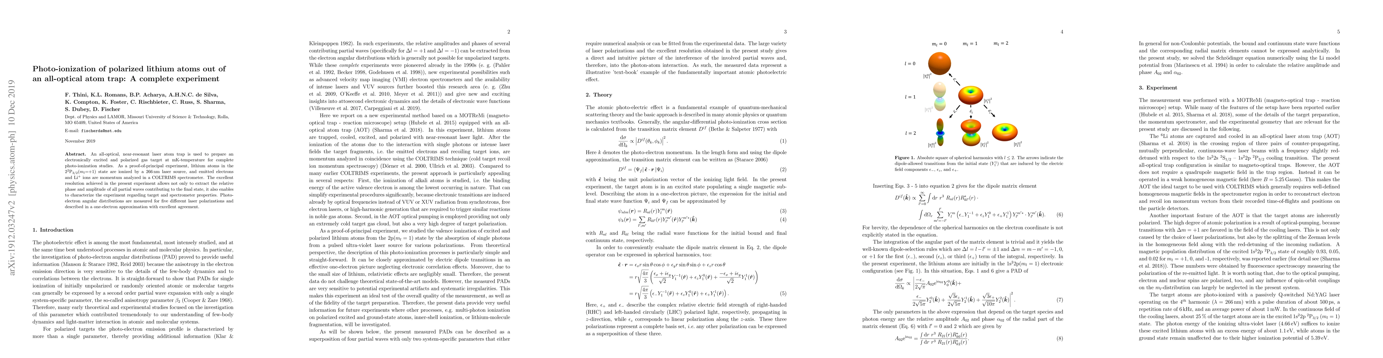 Researchers used an all-optical atom trap to study photo-ionization of polarized lithium atoms, achieving excellent resolution and characterizing the experiment's target and spectrometer properties. The results showed excellent agreement with one-electron approximation for photo-electron angular distributions under different laser polarizations.