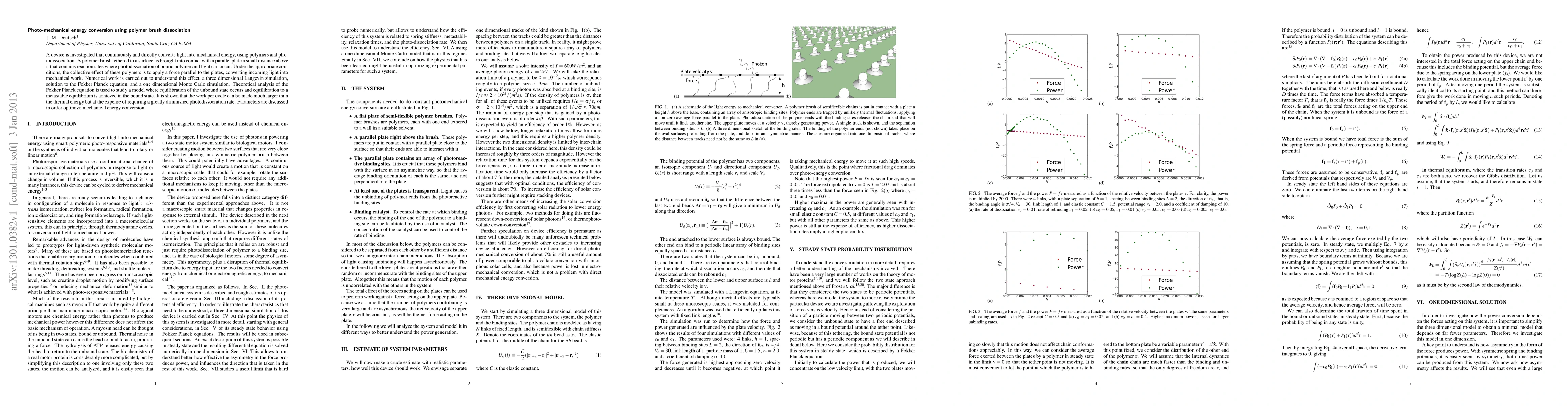 A device is investigated that continuously and directly converts light into mechanical energy, using polymers and photodissociation. A polymer brush tethered to a surface, is brought into contact with a parallel plate a small distance above it that contains reaction sites where photodissociation of bound polymer and light can occur. Under the appropriate conditions, the collective effect of these polymers is to apply a force parallel to the plates, converting incoming light into mechanical work. Numerical work is carried out to understand this effect, a three dimensional Langevin simulation, solution to the Fokker Planck equation, and a one dimensional Monte Carlo simulation. Theoretical analysis of the Fokker Planck equation is used to study a model where equilibration of the unbound state occurs and equilibration to a metastable equilibrium is achieved in the bound state. It is shown that the work per cycle can be made much larger than the thermal energy but at the expense of requiring a greatly diminished photodissociation rate. Parameters are discussed in order optimize mechanical energy conversion.