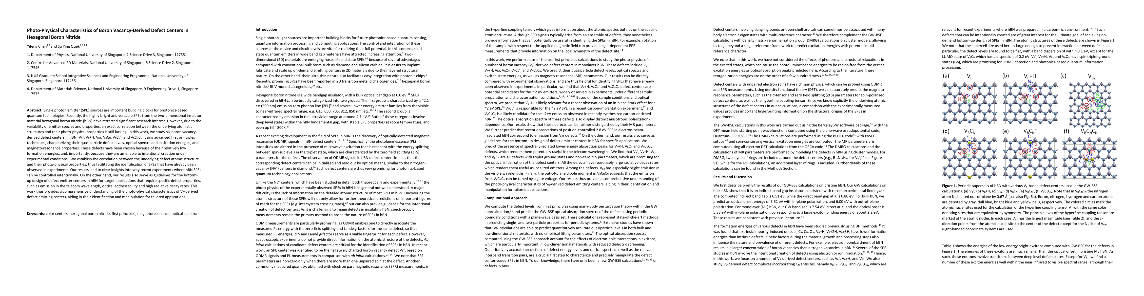 This research investigates six boron vacancy-derived defect centers in hexagonal boron nitride (hBN) to correlate their atomic structures with photo-physical properties, including optical spectra and excitation energies. The findings provide insights into existing experimental observations and guidelines for designing specific defect emitters for quantum technologies.