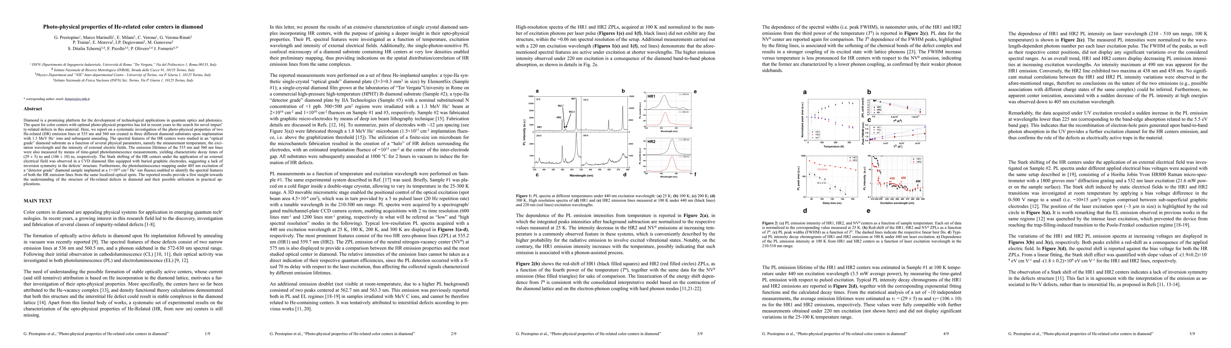 This paper investigates the photo-physical properties of He-related color centers in diamond, focusing on two emission lines at 535 nm and 560 nm. The study reveals distinct emission lifetimes and Stark shifting under electric fields, suggesting potential applications in quantum optics and photonics.