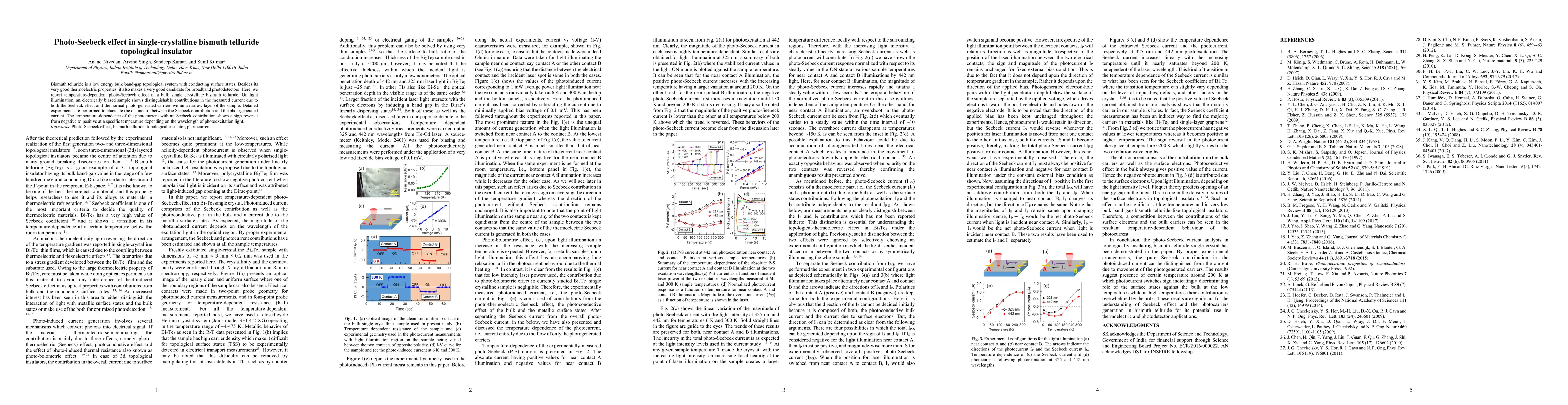 This paper investigates the temperature-dependent photo-Seebeck effect in single-crystalline bismuth telluride, identifying distinct contributions from the Seebeck effect and photogenerated carriers. The study reveals a sign reversal in the photocurrent without Seebeck contribution at a specific temperature, contingent on the wavelength of the photoexcitation light.