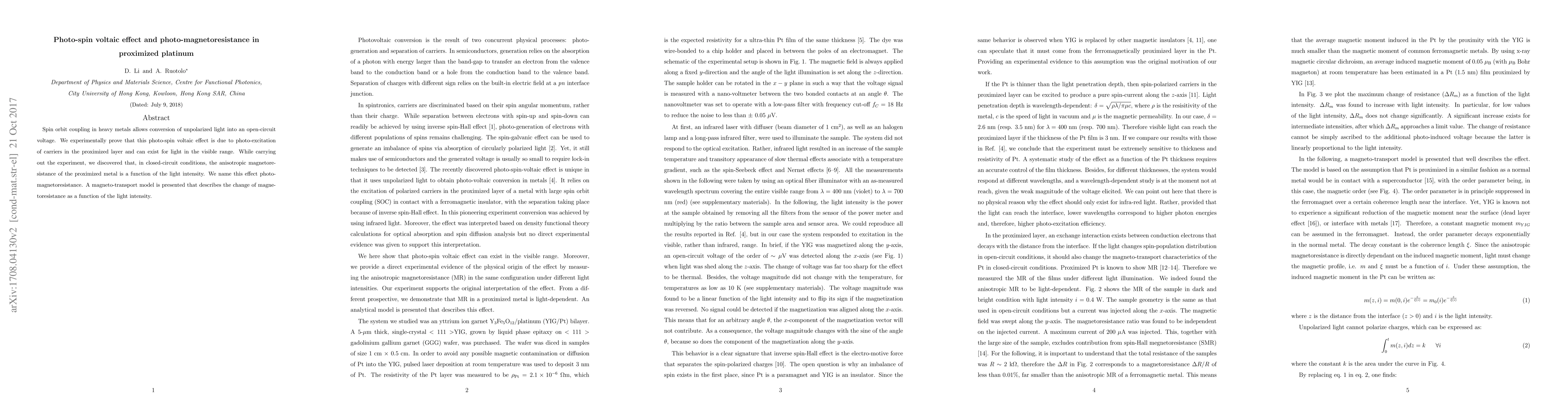 Spin orbit coupling in heavy metals allows conversion of unpolarized light into an open-circuit voltage. We experimentally prove that this photo-spin voltaic effect is due to photo-excitation of carriers in the proximized layer and can exist for light in the visible range. While carrying out the experiment, we discovered that, in closed-circuit conditions, the anisotropic magnetoresistance of the proximized metal is a function of the light intensity. We name this effect photo-magnetoresistance. A magneto-transport model is presented that describes the change of magnetoresistance as a function of the light intensity.