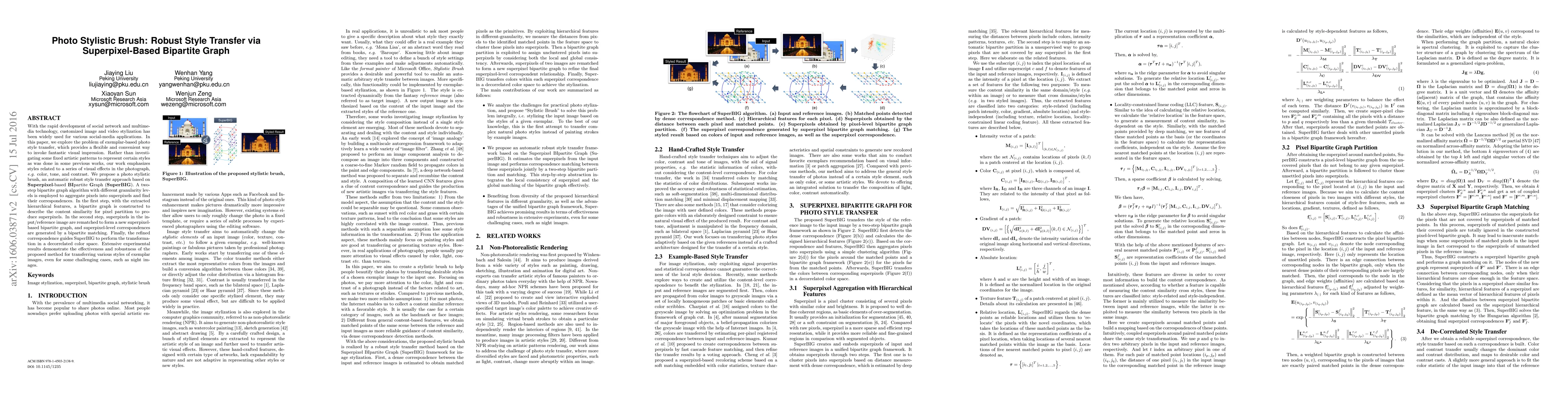 This paper proposes a photo stylistic brush for robust exemplar-based style transfer using a Superpixel-based Bipartite Graph (SuperBIG). The method employs a two-step bipartite graph algorithm to aggregate pixels into superpixels and establish correspondences, enabling flexible stylization of color, tone, and contrast, and demonstrating effectiveness even for challenging cases like night images.