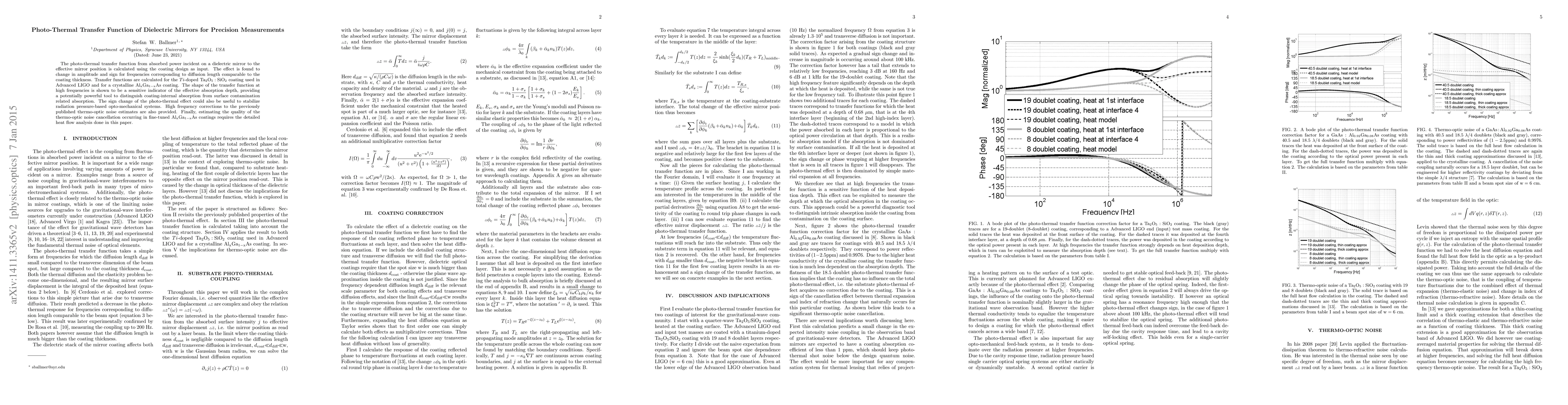 The photo-thermal transfer function from absorbed power incident on a dielectric mirror to the effective mirror position is calculated using the coating design as input. The effect is found to change in amplitude and sign for frequencies corresponding to diffusion length comparable to the coating thickness. Transfer functions are calculated for the $Ti$-doped ${\rm Ta_2O_5:SiO_2}$ coating used in Advanced LIGO and for a crystalline ${\rm Al_xGa_{1-x}As}$ coating. The shape of the transfer function at high frequencies is shown to be a sensitive indicator of the effective absorption depth, providing a potentially powerful tool to distinguish coating-internal absorption from surface contamination related absorption. The sign change of the photo-thermal effect could also be useful to stabilize radiation pressure-based opto-mechanical systems. High frequency corrections to the previously published thermo-optic noise estimates are also provided. Finally, estimating the quality of the thermo-optic noise cancellation occurring in fine-tuned ${\rm Al_xGa_{1-x}As}$ coatings requires the detailed heat flow analysis done in this paper.