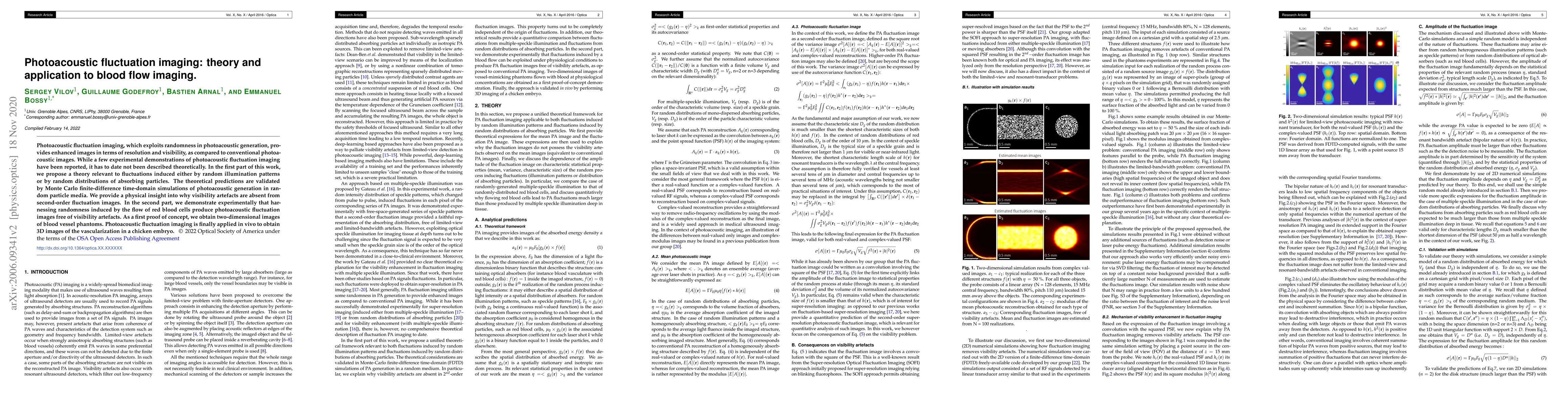 Photoacoustic fluctuation imaging, which exploits randomness in photoacoustic generation, provides enhanced images in terms of resolution and visibility, as compared to conventional photoacoustic images. While a few experimental demonstrations of photoacoustic fluctuation imaging have been reported, it has to date not been described theoretically. In the first part of this work, we propose a theory relevant to fluctuations induced either by random illumination patterns or by random distributions of absorbing particles. The theoretical predictions are validated by Monte Carlo finite-difference time-domain simulations of photoacoustic generation in random particle media. We provide a physical insight into why visibility artefacts are absent from second-order fluctuation images. In the second part, we demonstrate experimentally that harnessing randomness induced by the flow of red blood cells produce photoacoustic fluctuation images free of visibility artefacts. As a first proof of concept, we obtain two-dimensional images of blood vessel phantoms. Photoacoustic fluctuation imaging is finally applied in vivo to obtain 3D images of the vascularization in a chicken embryo.