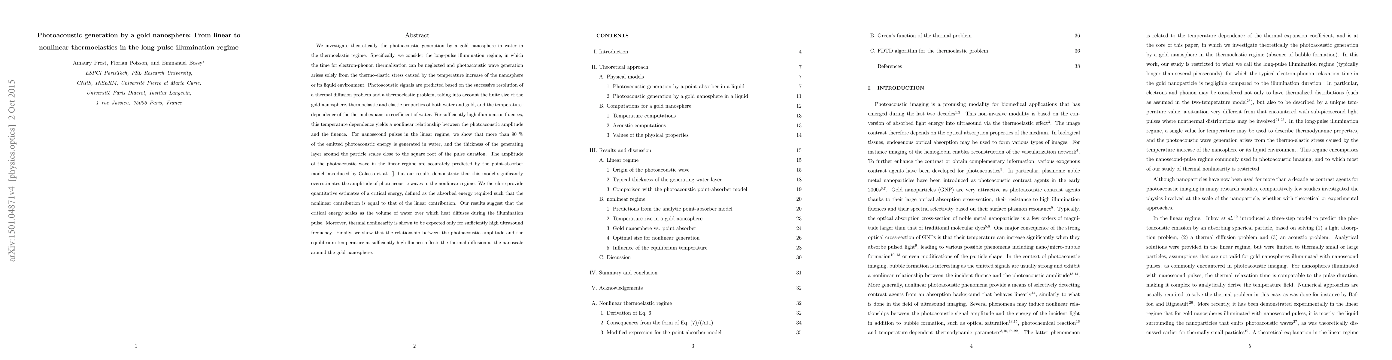 This paper explores the photoacoustic generation by a gold nanosphere in water under long-pulse illumination, revealing a nonlinear thermoelastic response due to the temperature-dependent thermal expansion of water. The study finds that the point-absorber model significantly overestimates nonlinear effects, and it provides critical energy estimates for the transition from linear to nonlinear photoacoustic wave generation.