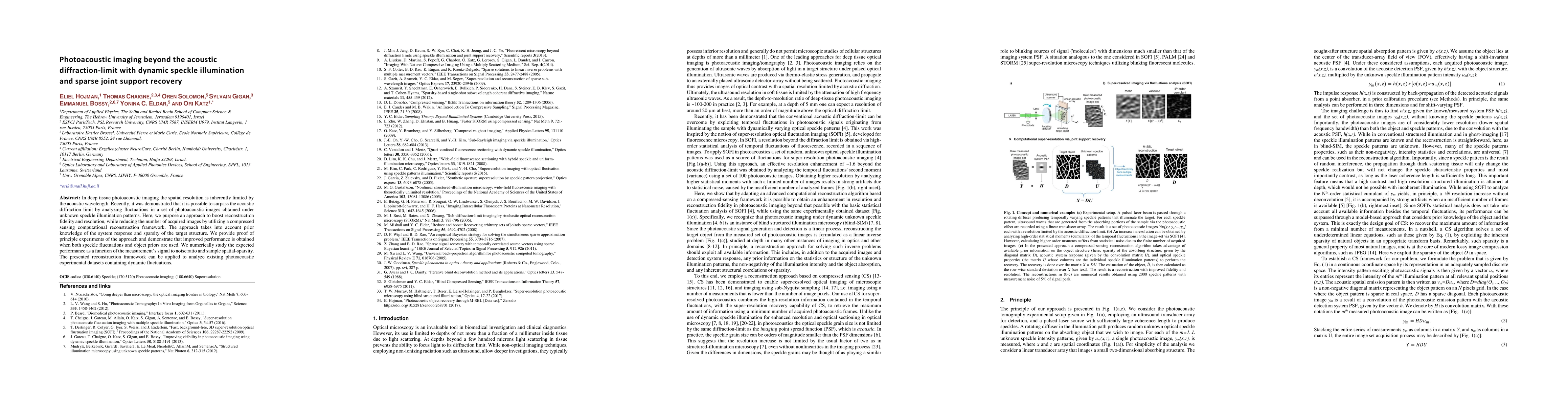 This paper proposes a method to enhance photoacoustic imaging resolution beyond the acoustic diffraction limit using dynamic speckle illumination and sparse joint support recovery. The approach leverages compressed sensing to reconstruct high-fidelity images from fewer acquisitions, improving performance when combined with object priors and noise ratio considerations.