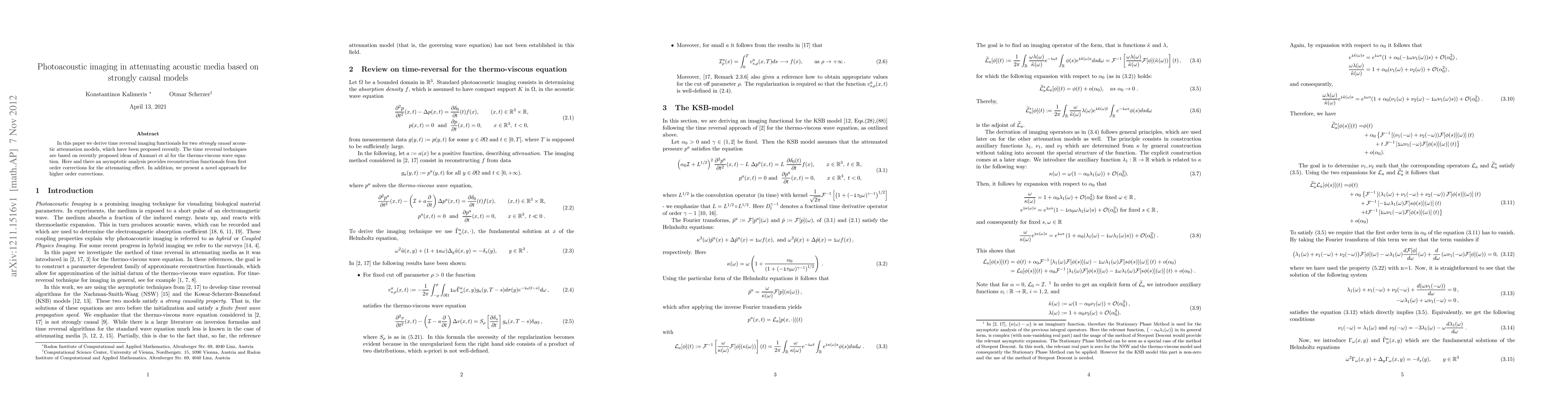 This paper develops time reversal imaging functionals for two strongly causal acoustic attenuation models using methods from Ammari et al. It introduces novel higher-order correction approaches to improve photoacoustic imaging in attenuating media.