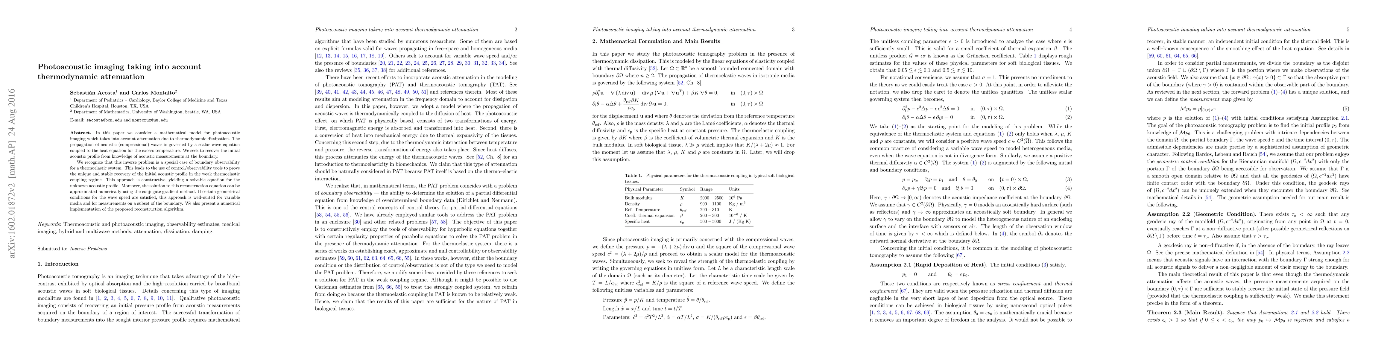 In this paper we consider a mathematical model for photoacoustic imaging which takes into account attenuation due to thermodynamic dissipation. The propagation of acoustic (compressional) waves is governed by a scalar wave equation coupled to the heat equation for the excess temperature. We seek to recover the initial acoustic profile from knowledge of acoustic measurements at the boundary. We recognize that this inverse problem is a special case of boundary observability for a thermoelastic system. This leads to the use of control/observability tools to prove the unique and stable recovery of the initial acoustic profile in the weak thermoelastic coupling regime. This approach is constructive, yielding a solvable equation for the unknown acoustic profile. Moreover, the solution to this reconstruction equation can be approximated numerically using the conjugate gradient method. If certain geometrical conditions for the wave speed are satisfied, this approach is well--suited for variable media and for measurements on a subset of the boundary. We also present a numerical implementation of the proposed reconstruction algorithm.