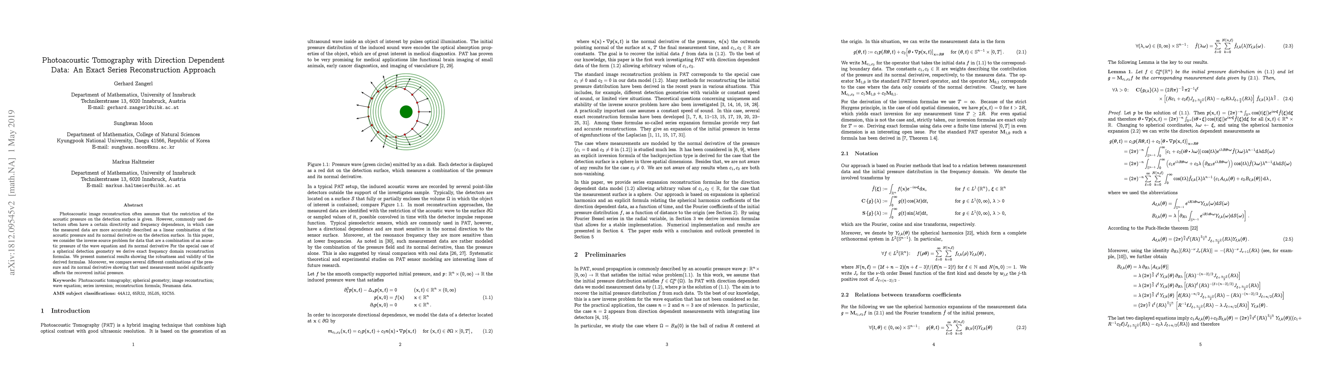 Photoacoustic image reconstruction often assumes that the restriction of the acoustic pressure on the detection surface is given. However, commonly used detectors often have a certain directivity and frequency dependence, in which case the measured data are more accurately described as a linear combination of the acoustic pressure and its normal derivative on the detection surface. In this paper, we consider the inverse source problem for data that are a combination of an acoustic pressure of the wave equation and its normal derivative For the special case of a spherical detection geometry we derive exact frequency domain reconstruction formulas. We present numerical results showing the robustness and validity of the derived formulas. Moreover, we compare several different combinations of the pressure and its normal derivative showing that used measurement model significantly affects the recovered initial pressure.
