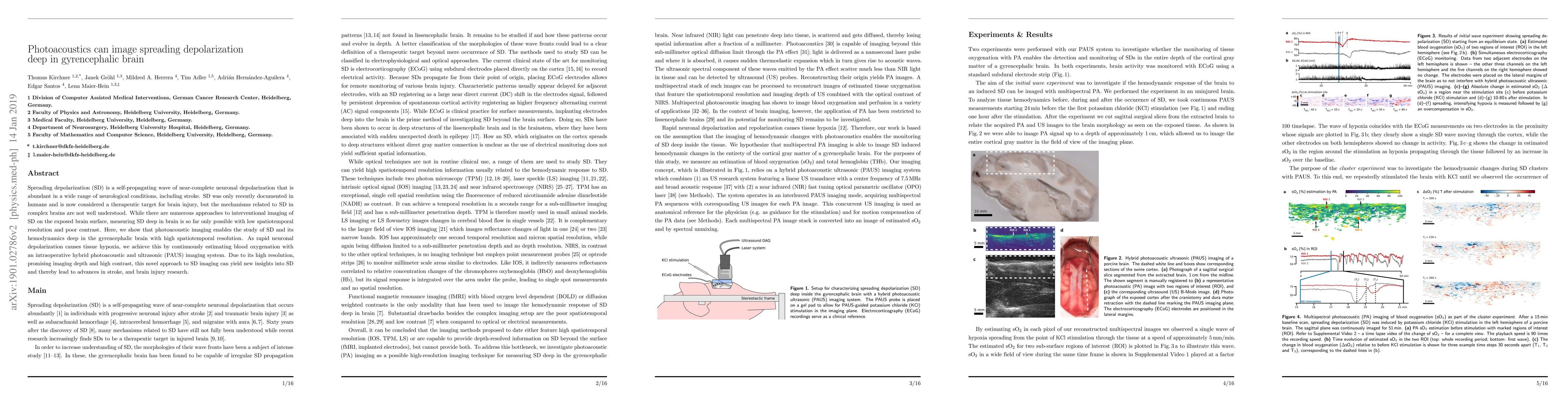 This paper demonstrates that photoacoustic imaging, combined with an intraoperative hybrid photoacoustic and ultrasonic imaging system, enables high-resolution spatiotemporal imaging of spreading depolarization deep within gyrencephalic brains. This novel approach provides insights into the hemodynamics of spreading depolarization, potentially advancing stroke and brain injury research.