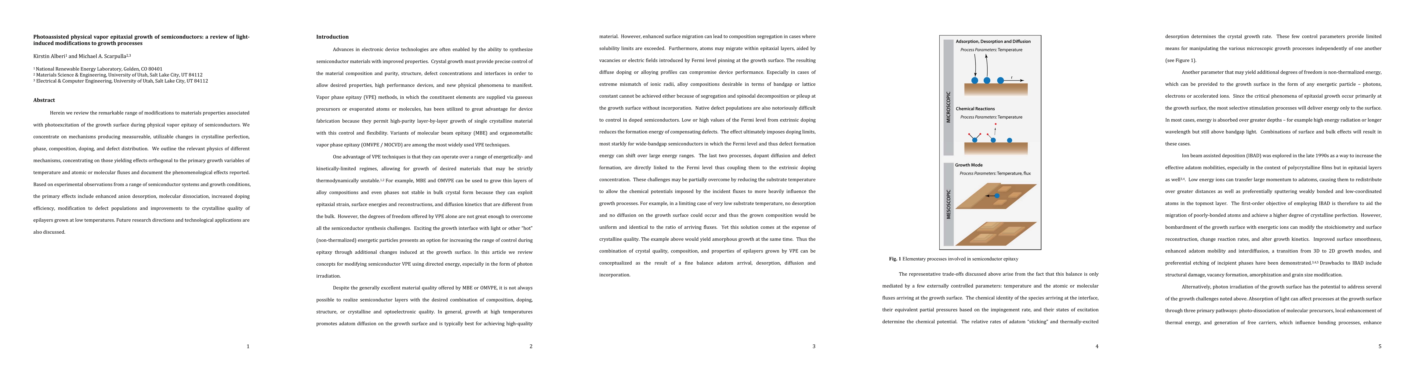 Herein we review the remarkable range of modifications to materials properties associated with photoexcitation of the growth surface during physical vapor epitaxy of semiconductors. We concentrate on mechanisms producing measureable, utilizable changes in crystalline perfection, phase, composition, doping, and defect distribution. We outline the relevant physics of different mechanisms, concentrating on those yielding effects orthogonal to the primary growth variables of temperature and atomic or molecular fluxes and document the phenomenological effects reported. Based on experimental observations from a range of semiconductor systems and growth conditions, the primary effects include enhanced anion desorption, molecular dissociation, increased doping efficiency, modification to defect populations and improvements to the crystalline quality of epilayers grown at low temperatures. Future research directions and technological applications are also discussed.