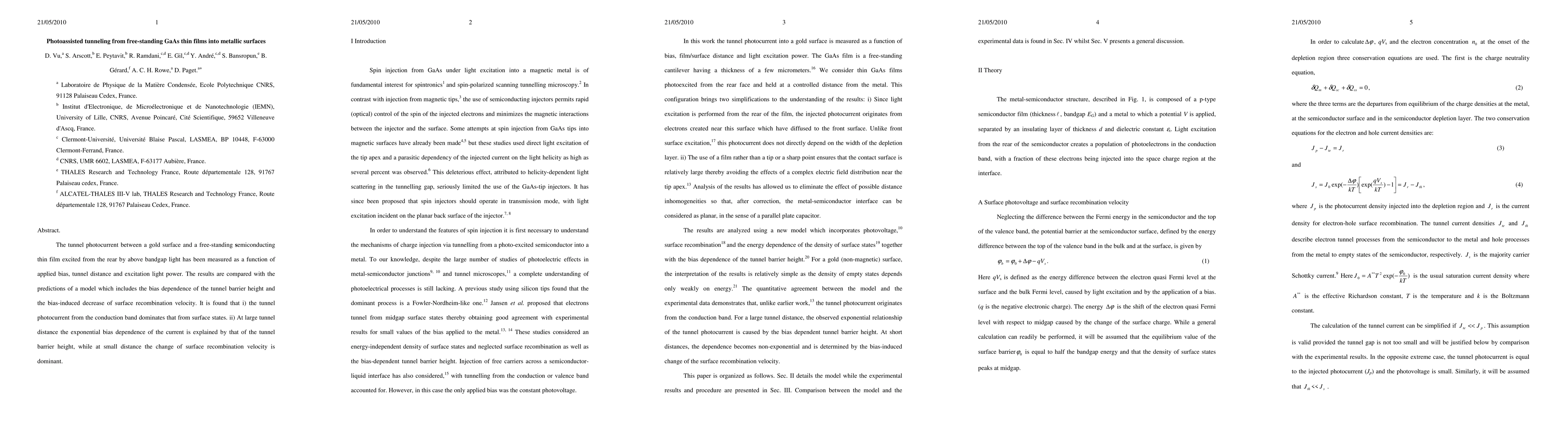The tunnel photocurrent between a gold surface and a free-standing semiconducting thin film excited from the rear by above bandgap light has been measured as a function of applied bias, tunnel distance and excitation light power. The results are compared with the predictions of a model which includes the bias dependence of the tunnel barrier height and the bias-induced decrease of surface recombination velocity. It is found that i) the tunnel photocurrent from the conduction band dominates that from surface states. ii) At large tunnel distance the exponential bias dependence of the current is explained by that of the tunnel barrier height, while at small distance the change of surface recombination velocity is dominant.