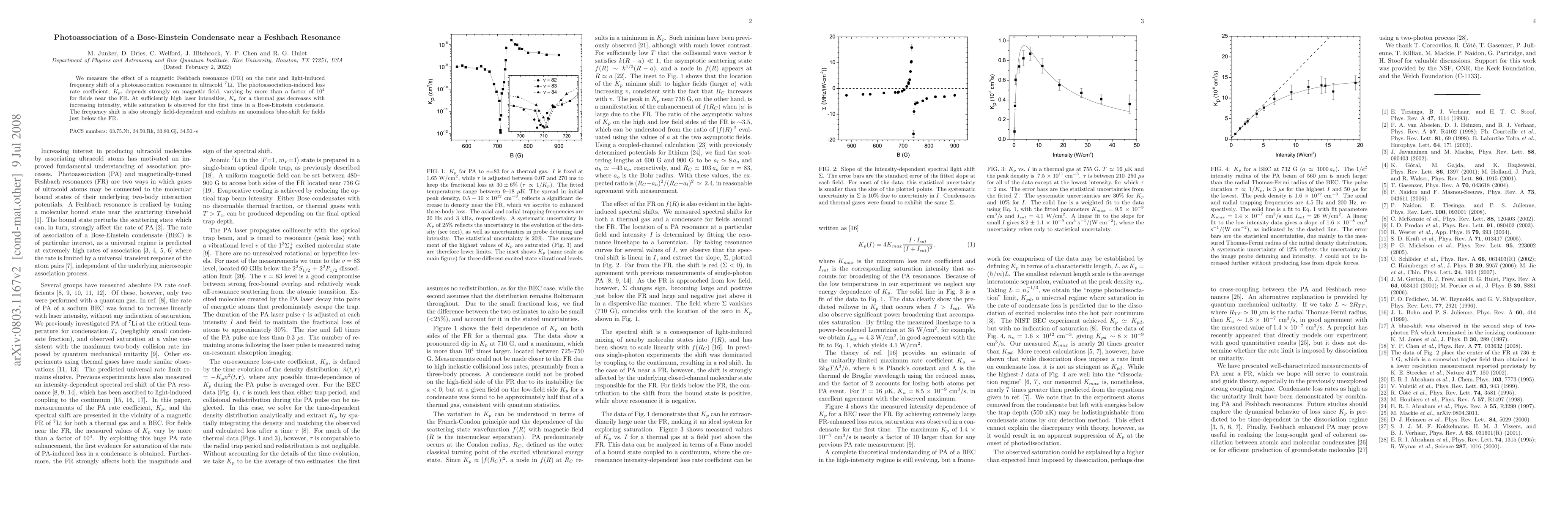 This paper investigates the impact of a magnetic Feshbach resonance on photoassociation in ultracold $^7$Li, finding that the loss rate coefficient varies dramatically near the resonance. Notably, saturation of the loss rate is observed for the first time in a Bose-Einstein condensate at high laser intensities.