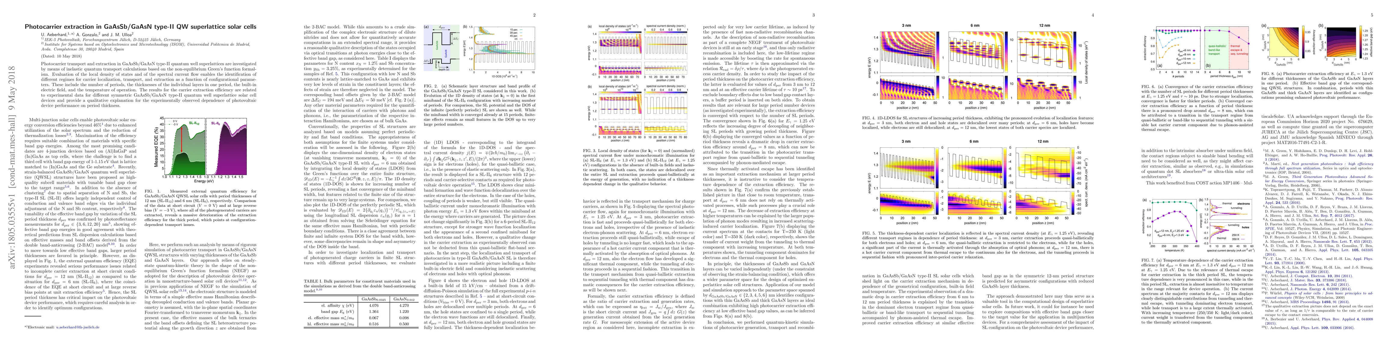 This paper investigates photocarrier extraction in GaAsSb/GaAsN type-II QW superlattice solar cells using quantum transport calculations, revealing the impact of configurational parameters on carrier localization, transport, and extraction. The results provide a qualitative explanation for experimentally observed photovoltaic device performance dependence on period thickness.