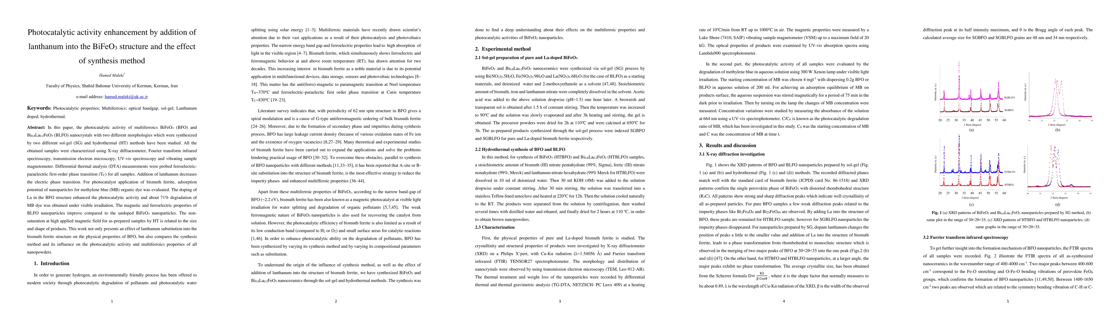 This paper investigates the photocatalytic enhancement in BiFeO3 (BFO) by doping with lanthanum to form Bi0.8La0.2FeO3 (BLFO), synthesized via sol-gel and hydrothermal methods, showing improved photocatalytic activity and multiferroic properties. The study finds that La doping boosts visible light degradation of methylene blue dye by 71% and enhances magnetic and ferroelectric properties.