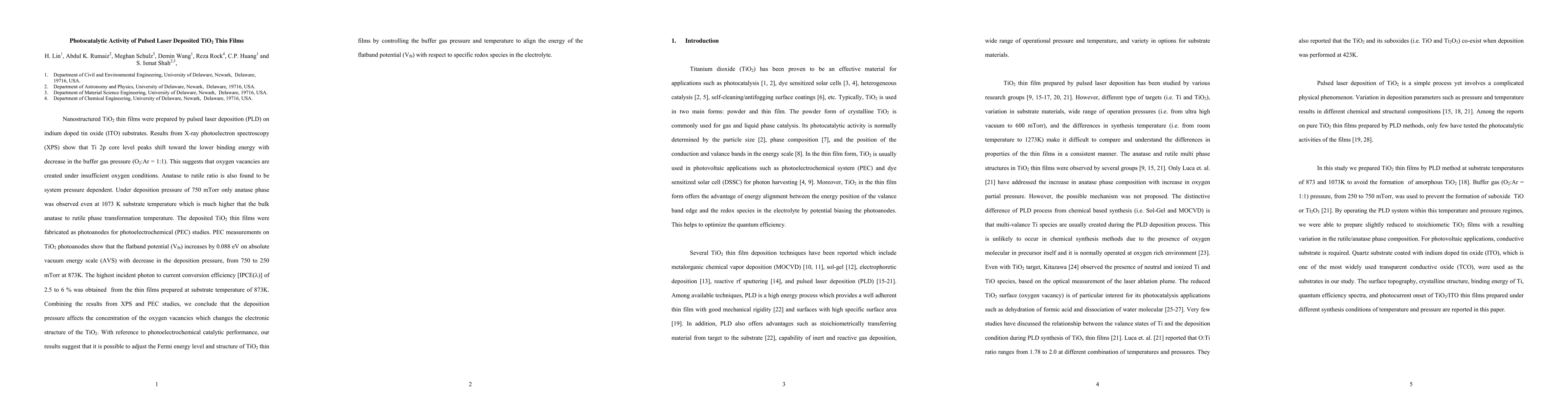 This study investigates the influence of deposition pressure on the photocatalytic activity of pulsed laser deposited TiO2 thin films. It finds that lower deposition pressures create oxygen vacancies, altering the electronic structure and enhancing photoelectrochemical performance, with an IPCE of up to 6% at 873K.