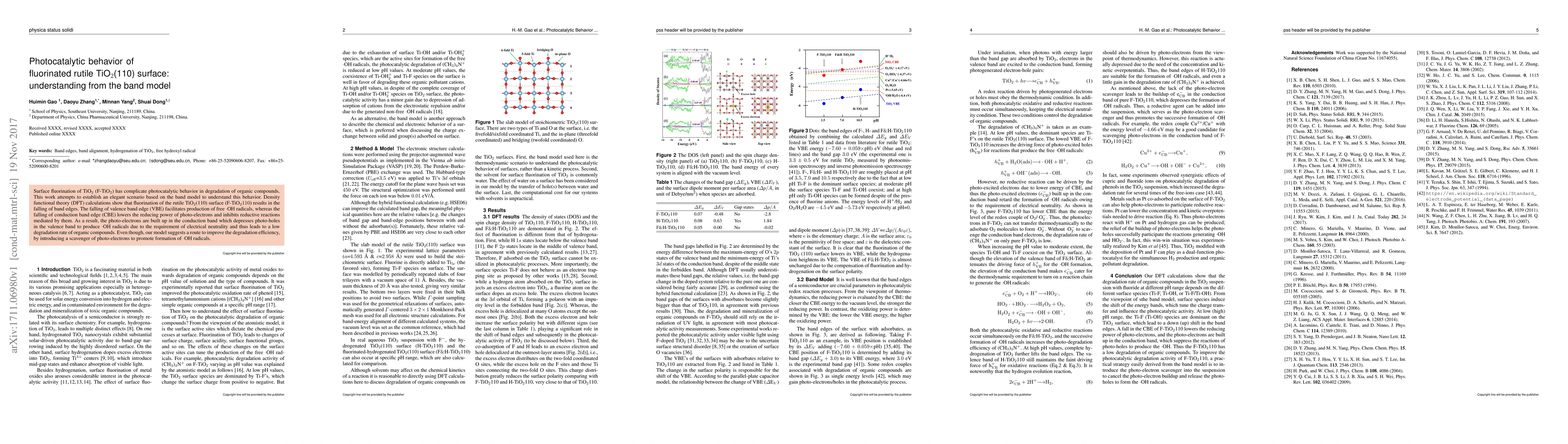 Summary: Fluorination of rutile TiO$_2$(110)$'s surface lowers band edges, enhancing $\cdot$OH radical production but inhibiting reductive reactions, leading to lower organic compound degradation. Introducing a photo-electron scavenger could improve degradation efficiency.