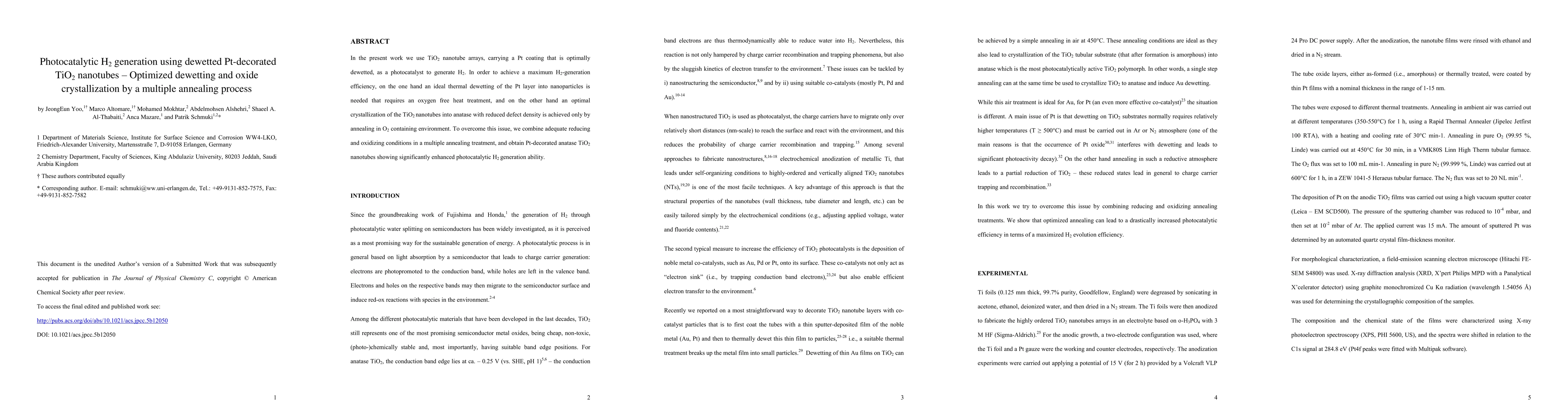 This paper investigates the use of dewetted Pt-decorated TiO2 nanotubes for photocatalytic H2 generation. A multiple annealing process optimizes both the dewetting of Pt into nanoparticles and the crystallization of TiO2 into anatase, achieving significantly enhanced H2 production efficiency.