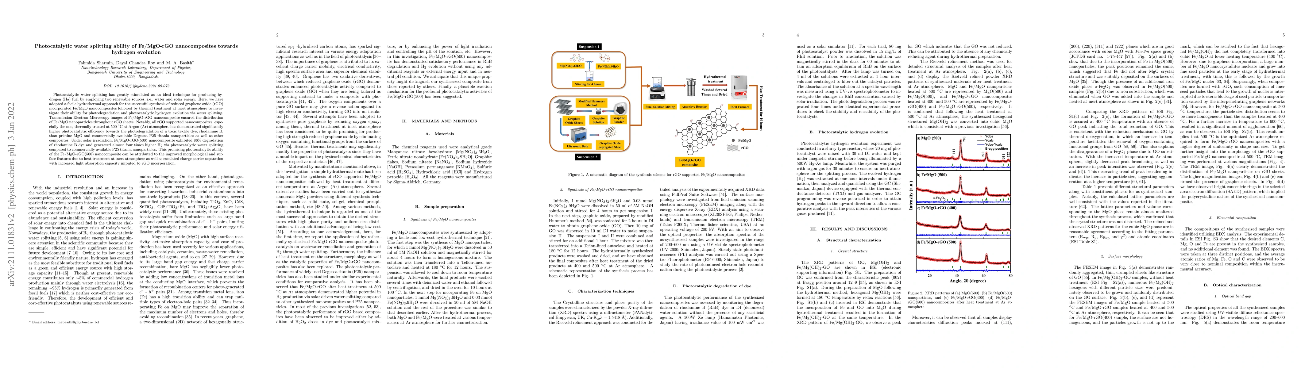 This study synthesized Fe/MgO-rGO nanocomposites via hydrothermal and thermal treatment methods, finding that the Fe/MgO-rGO nanocomposite treated at 500°C in an argon atmosphere demonstrated superior photocatalytic efficiency for hydrogen evolution and dye degradation compared to standard P25 titania nanoparticles, due to enhanced charge separation and light absorption facilitated by rGO incorporation.
