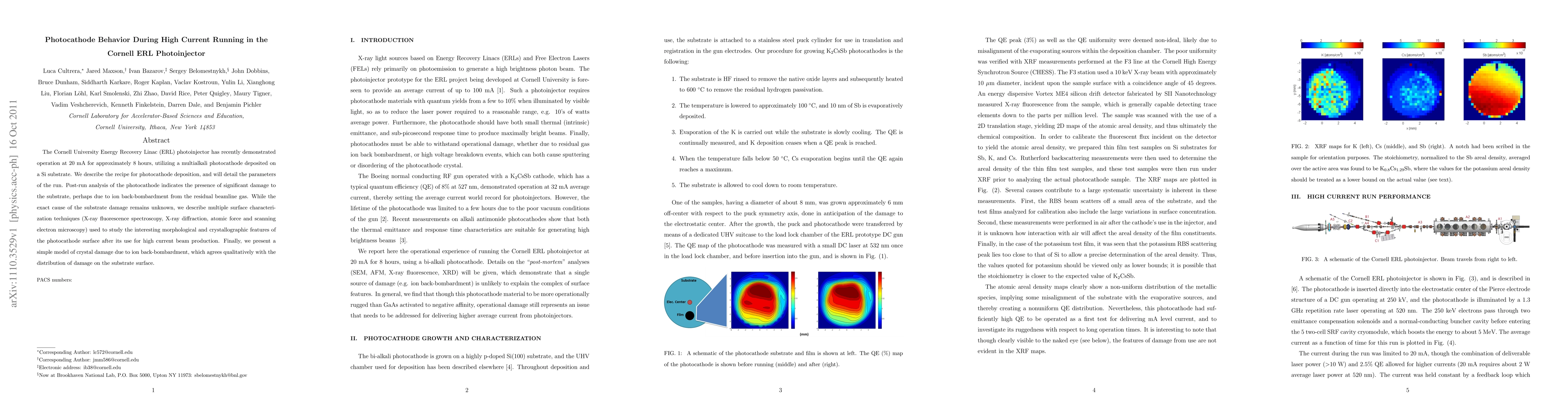 The Cornell ERL photoinjector operated at 20 mA for 8 hours, revealing significant substrate damage likely due to ion back-bombardment from residual beamline gas. Surface characterization techniques identified morphological and crystallographic features, and a model of ion-induced crystal damage was proposed.