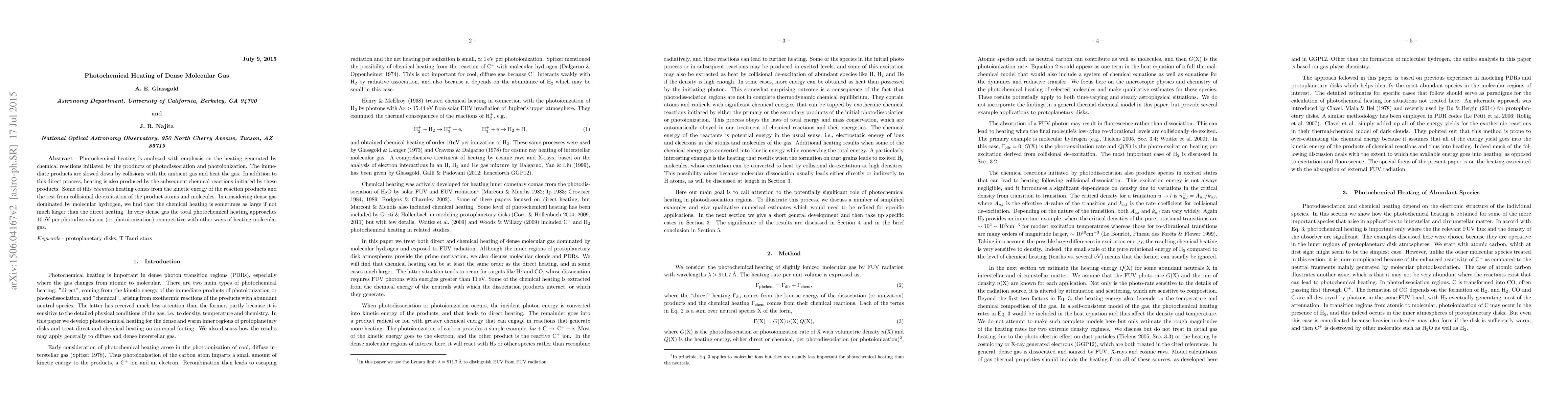 This research analyzes photochemical heating in dense molecular gas, finding that chemical reactions initiated by photodissociation and photoionization products contribute significantly to heating. In dense molecular hydrogen gas, chemical heating can be as large as or larger than direct heating, with total photochemical heating approaching 10 eV per photodissociation or photoionization event in extremely dense gas.