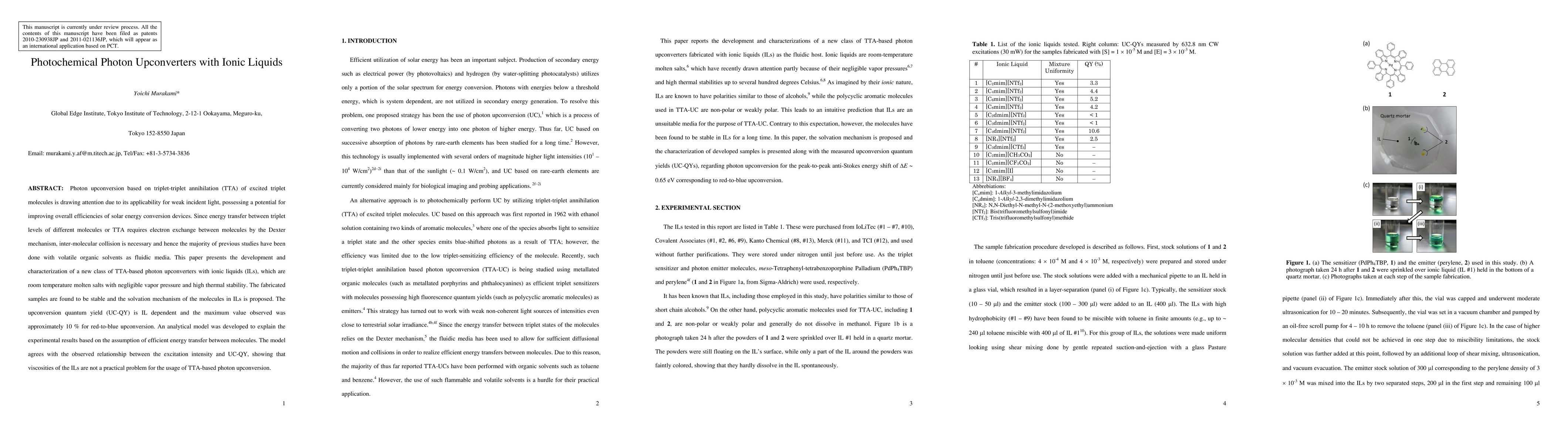Photon upconversion based on triplet-triplet annihilation (TTA) of excited triplet molecules is drawing attention due to its applicability for weak incident light, possessing a potential for improving overall efficiencies of solar energy conversion devices. Since energy transfer between triplet levels of different molecules or TTA requires electron exchange between molecules by the Dexter mechanism, inter-molecular collision is necessary and hence the majority of previous studies have been done with volatile organic solvents as fluidic media. This paper presents the development and characterization of a new class of TTA-based photon upconverters with ionic liquids (ILs), which are room temperature molten salts with negligible vapor pressure and high thermal stability. The fabricated samples are found to be stable and the solvation mechanism of the molecules in ILs is proposed. The upconversion quantum yield (UC-QY) is IL dependent and the maximum value observed was approximately 10 % for red-to-blue upconversion. An analytical model was developed to explain the experimental results based on the assumption of efficient energy transfer between molecules. The model agrees with the observed relationship between the excitation intensity and UC-QY, showing that viscosities of the ILs are not a practical problem for the usage of TTA-based photon upconversion.