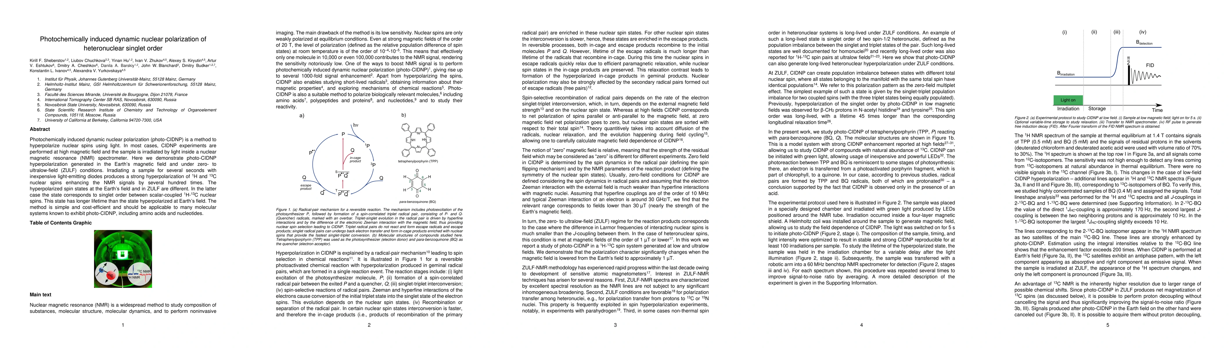 This paper demonstrates photochemically induced dynamic nuclear polarization (photo-CIDNP) in Earth magnetic field and zero- to ultralow field (ZULF) conditions, achieving strong hyperpolarization of 1H and 13C nuclear spins using inexpensive light-emitting diodes. The hyperpolarized state in ZULF corresponds to singlet order between scalar-coupled 1H-13C spins, offering a longer lifetime and broader applicability to molecular systems.