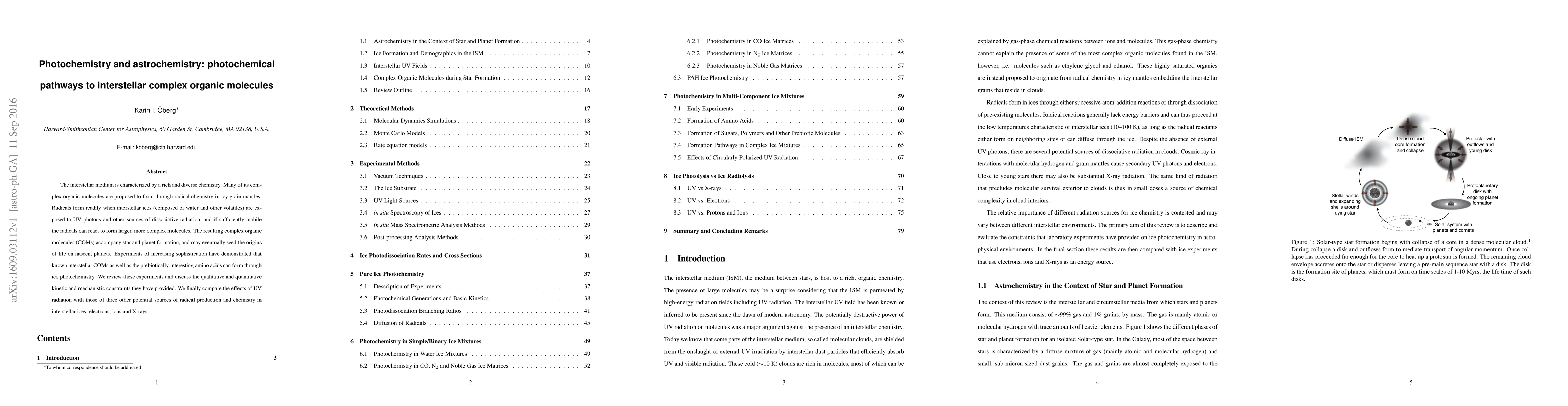 This paper reviews the formation of interstellar complex organic molecules (COMs) through photochemical pathways in icy grain mantles exposed to UV photons and other dissociative radiation. It discusses the kinetic and mechanistic constraints provided by sophisticated experiments and compares the effects of UV radiation with electrons, ions, and X-rays on radical production and chemical reactions in interstellar ices.
