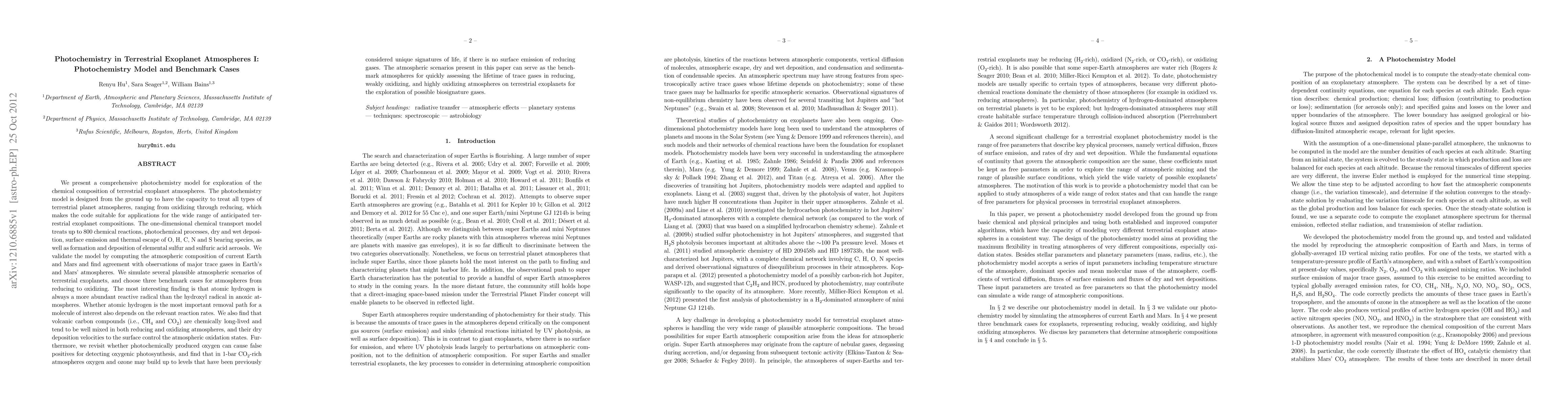 This paper presents a comprehensive photochemistry model for analyzing the chemical composition of terrestrial exoplanet atmospheres, simulating up to 800 reactions and validating it with Earth and Mars data. Key findings include the dominance of atomic hydrogen over hydroxyl radicals in anoxic atmospheres and the long-lived nature of volcanic carbon compounds, which influence atmospheric oxidation states.