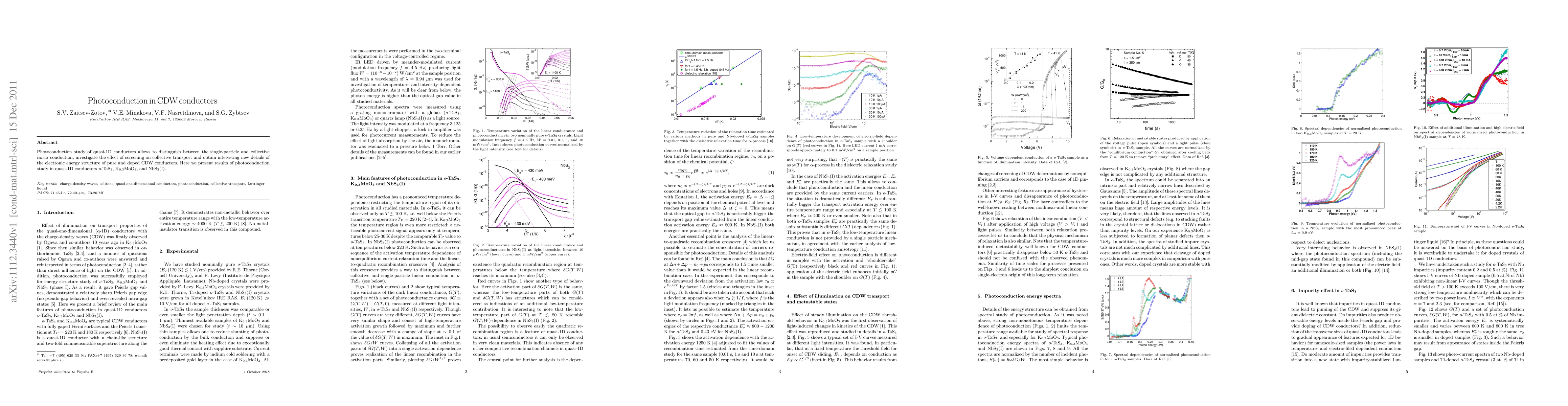 This paper investigates photoconduction in quasi-1D conductors to differentiate between single-particle and collective linear conduction, examining the impact of screening on collective transport and revealing new insights into the electronic energy structure of pure and doped charge density wave (CDW) conductors. Results focus on o-TaS$_3$, K$_{0.3}$MoO$_3$, and NbS$_3$(I).