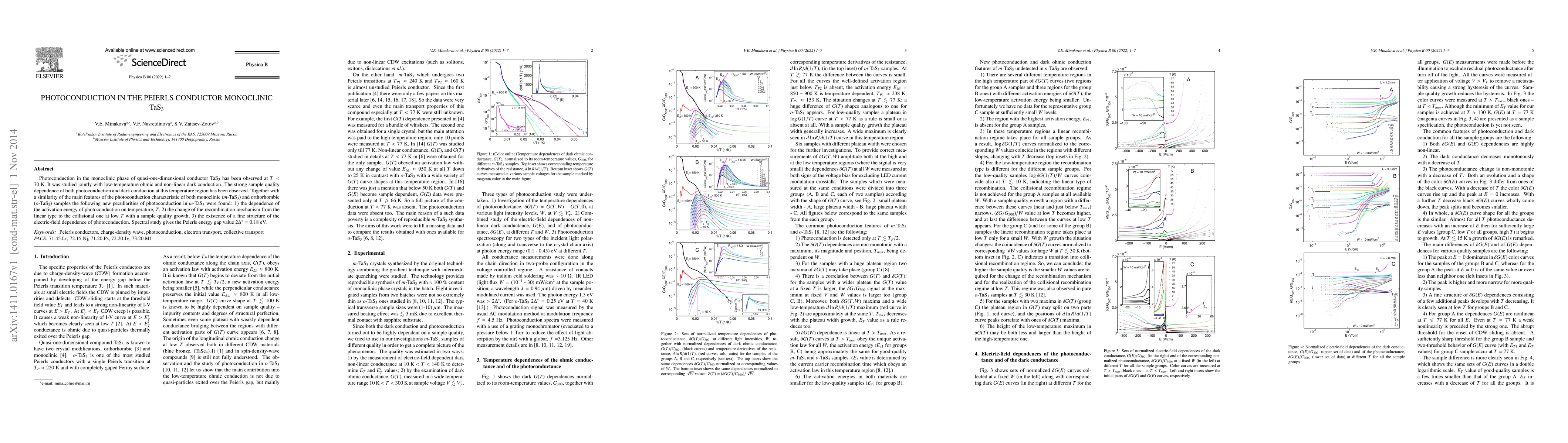 Photoconduction in monoclinic TaS$_3$ is observed below 70 K, exhibiting a strong dependence on sample quality and featuring an activation energy that varies with temperature, a change in recombination mechanism at low temperatures, and a fine structure in electric-field dependence. The Peierls energy gap is found to be 2$\Delta^* = 0.18$~eV.